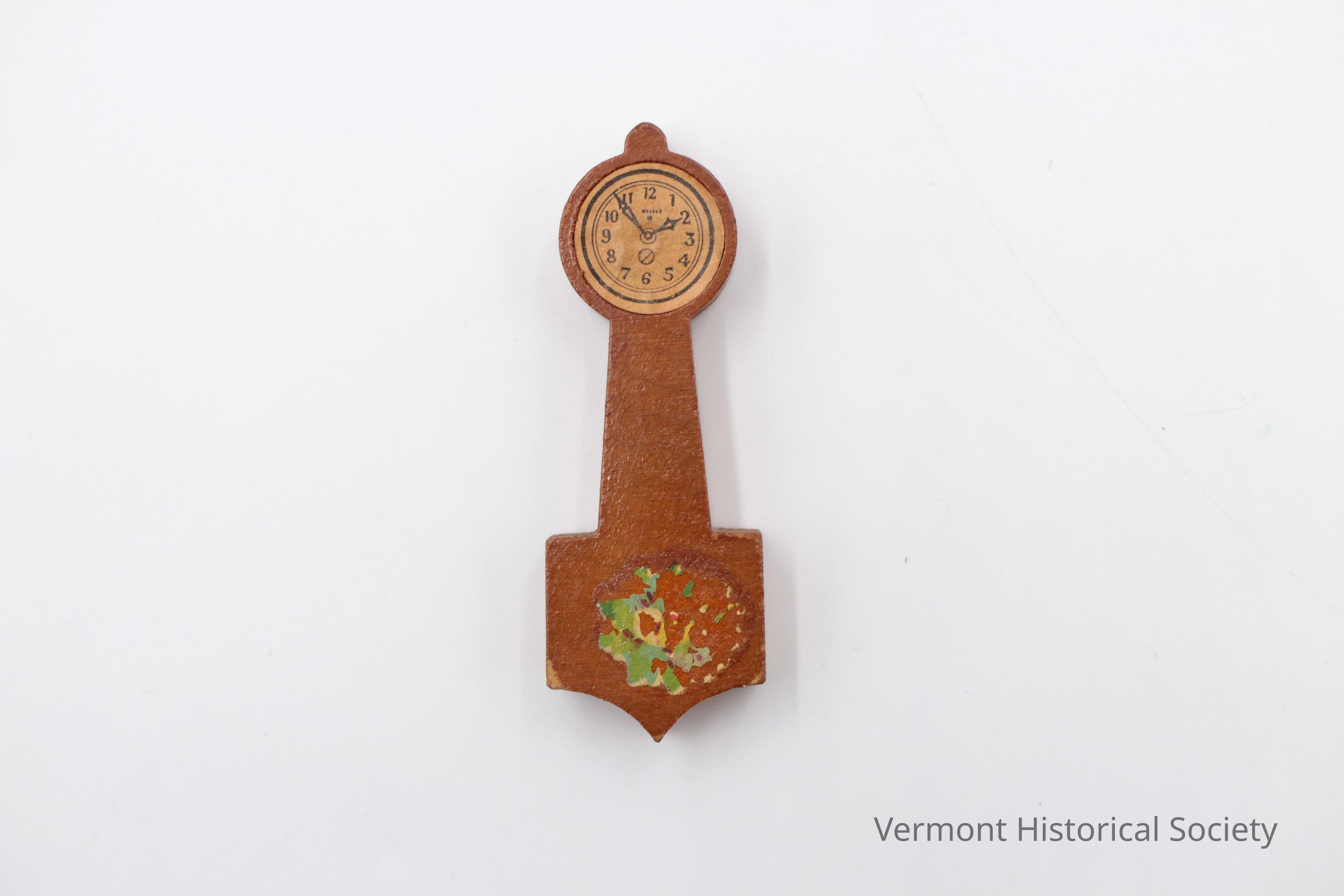 Miniature wooden wall clock sized for a dollhouse. The clock has a circular face at the top, and a long body, culminating a shield-shaped bottom piece. There is a sticker at the top representing the face, with Arabic numerals. The hands are placed at 2:54. There is a partially removed sticker at the bottom.Context