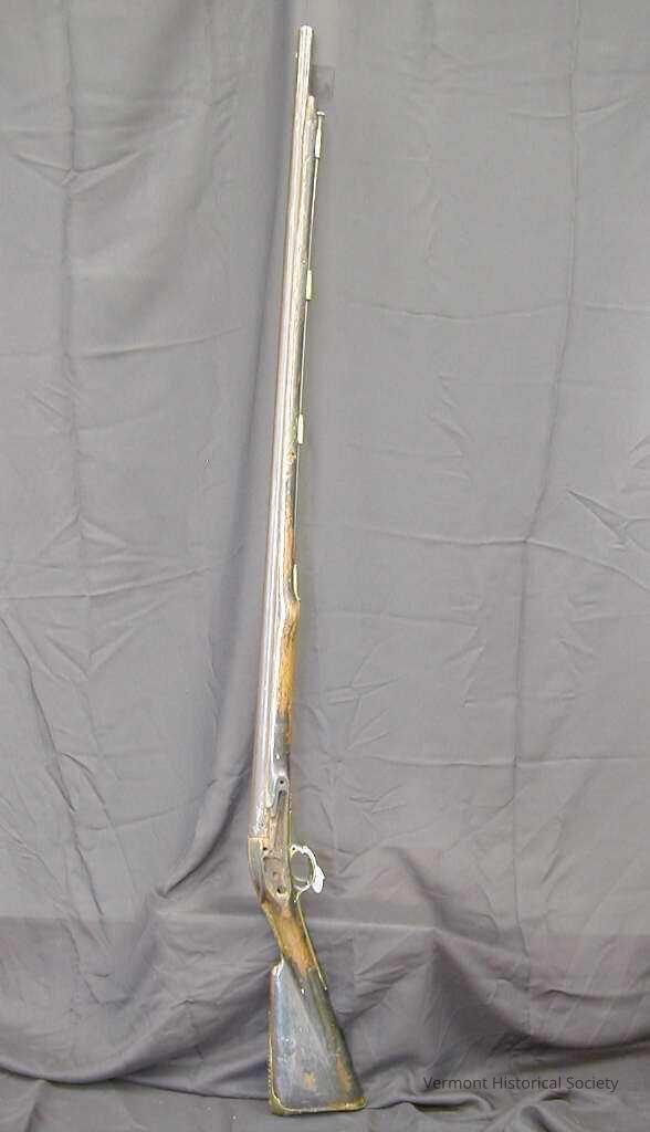Long-barreled musket. The end of the stock plate is engraved with the dates 1749, 1776, 1777, 1772. The top plate is marked, "GR" with a crown below. The stock is engraved with the word, "Bennington" and the initials "ES".Context
