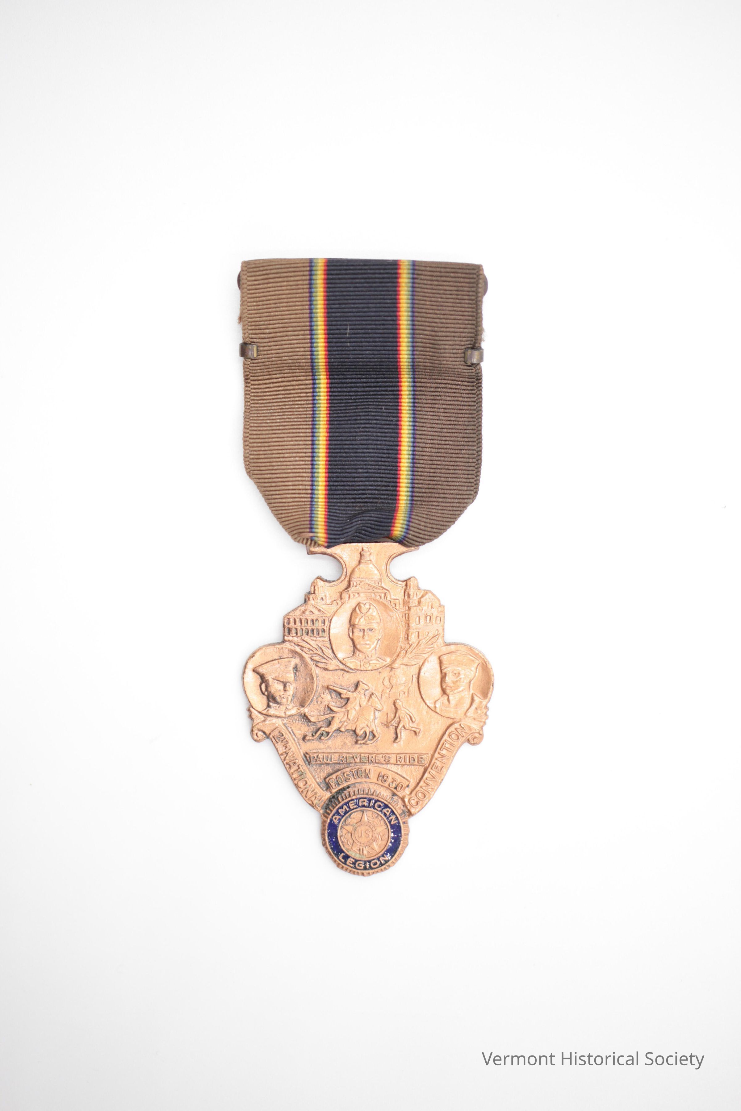 Membership ribbon consisting of a ribbon and metal medallion. The grosgrain ribbon is striped brown and black, separated by narrow rainbow stripes. The medallion is molded with a design of 3 bust portraits of men, an illustration of a man on a horse, and the words, "2TH [sic] NATIONAL CONVENTION / BOSTON 1930 / AMERICAN LEGION".