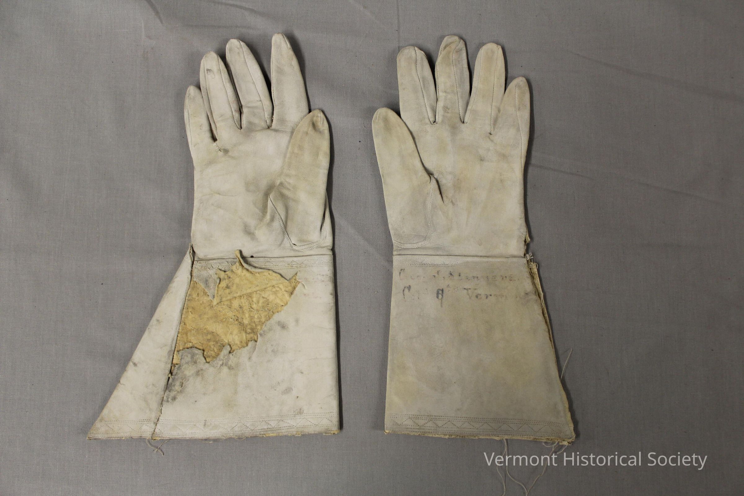 Pair of white leather gloves with wide, long cuffs. The gloves are polished with a white polish. The inner wrist of the left glove has the handwritten inscription, "Geo. J. Stannard/Co [illeg] Vermont". The edges of the cuffs are impressed with a zig-zag design.Context