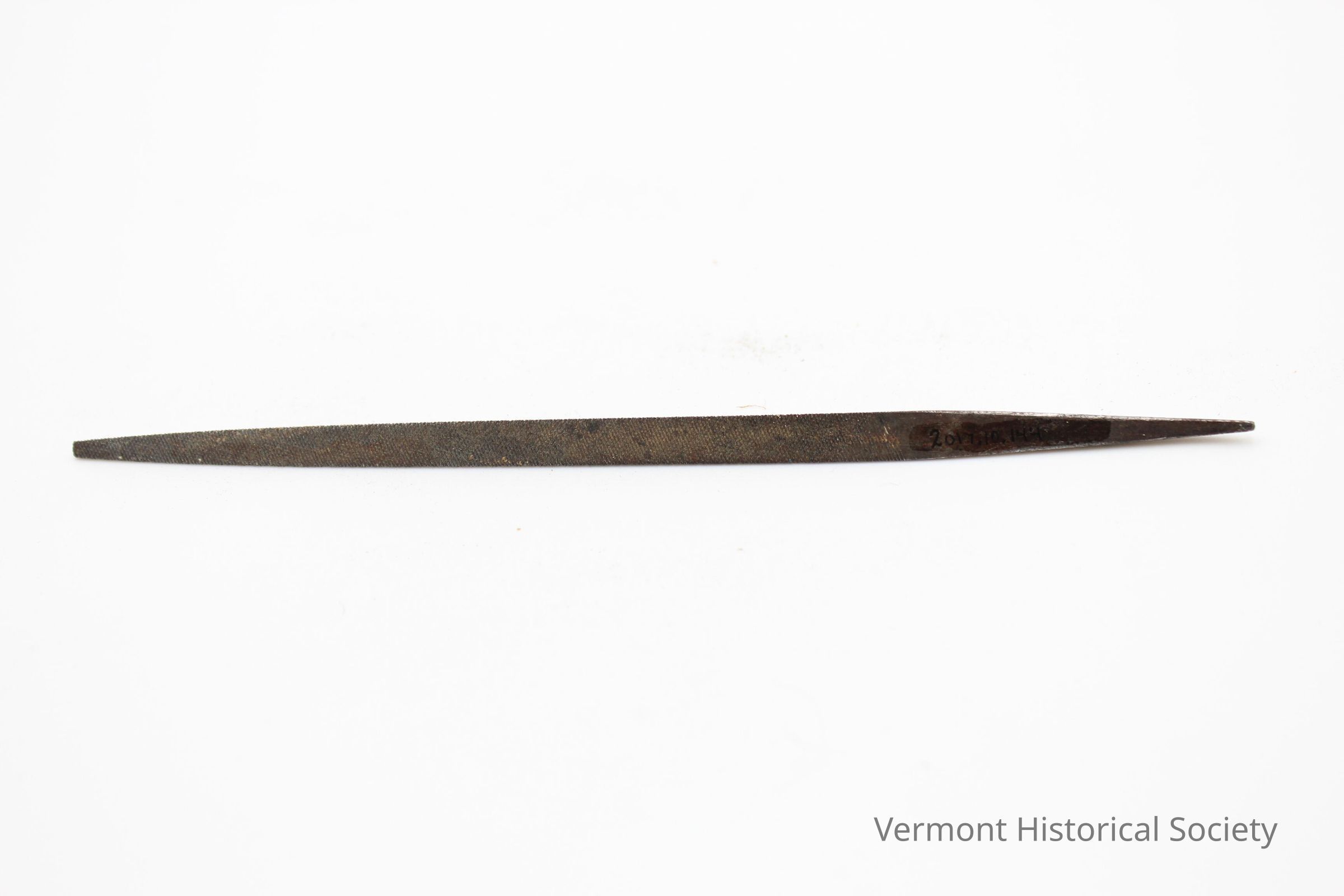 Triangular file, no handle, tapered point; overall length = 5 7/8"; three stars stamped into tang, with "OAS-USA" also imprinted on another side of the tang; no heel on this file and tang is only slight tapered with a bend at the end.Context