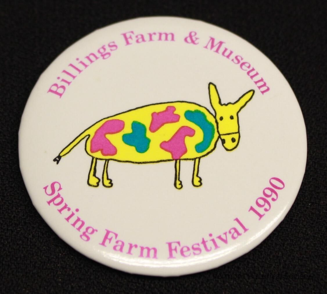 Round white button with a yellow, blue, and pink child's illustration of a cow and the pink inscription, "Billings Farm & Museum / Spring Farm Festival 1990".Context