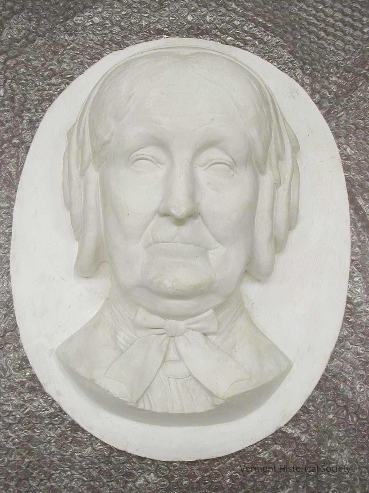 Bas relief plaster bust showing an elderly woman. Her hair is parted in the center, and she is wearing a bonnet that falls in layers on either side of her facing. She is wearing a high-necked blouse with a bow in the center of her neck and a small medallion beneath the bow. The background of the piece is an oval. The back of the sculpture is rough, with a concave portion behind the relief.
