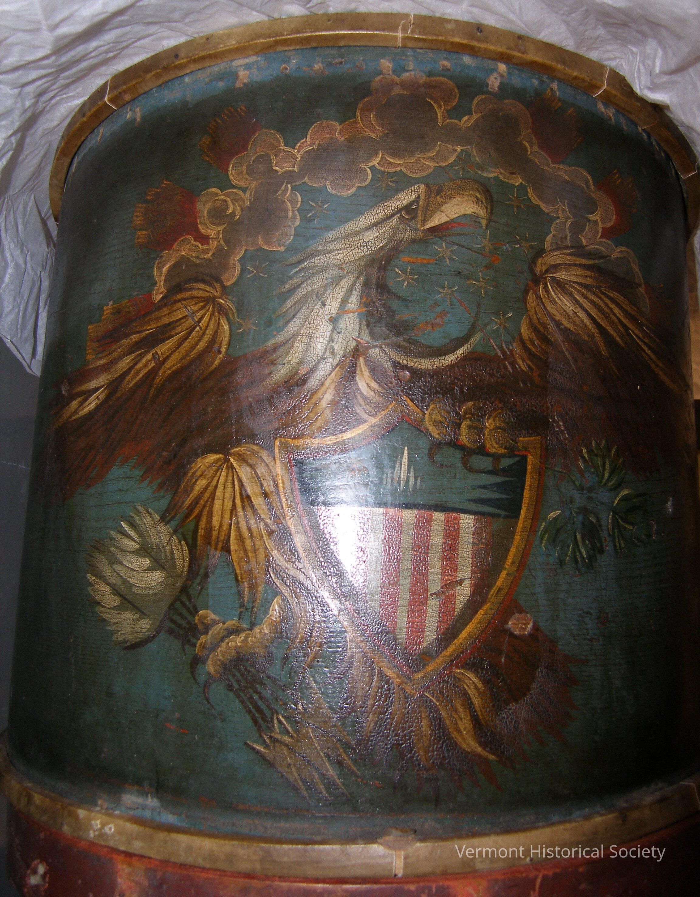 Round side drum. The shell is made from ash wood, stained medium brown, with a decorative tack pattern at the seam. One side is painted with a polychrome eagle and federal shiel on a blue ground. The wood counterhoops are painted red, each with ten holes for ropes. There are leather braces (8 extant) with serrated edges. It has vellum heads over wood flshhoops. There is a handwritten label that reads, "Drums made sold repaired by Henry Fraley Germantown".