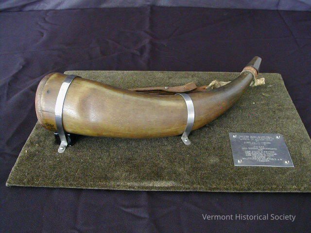 Undecorated powder horn mounted onto a plaque with two metal U rings. The end is sealed with a round wooden plug, and there is a leather strap tied to the center of the plug and the narrow end of the horn. The plaque indicates that the horn was taken from a dead British soldier at the Battle of Bunker Hill, by John Jacob Peeler of Vernon, Vermont.