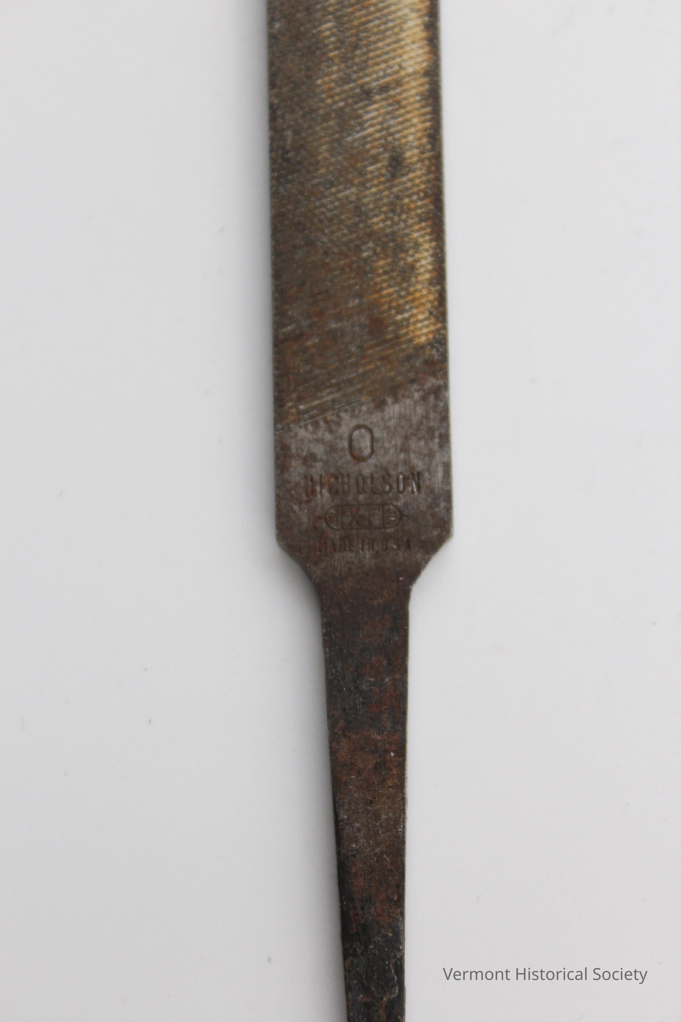 Metal hand file, no handle, point not tapered but squared off; overall length = 8 7/16"; manufacturer's mark shows a zero above the name Nicholson, on heel.Context