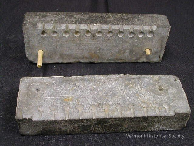 Rectangular bullet mold. The mold is split into two halves that join together with wooden dowels. When joined, there is a small well at the seam with drill channels leading to round molds. There are eleven holes.