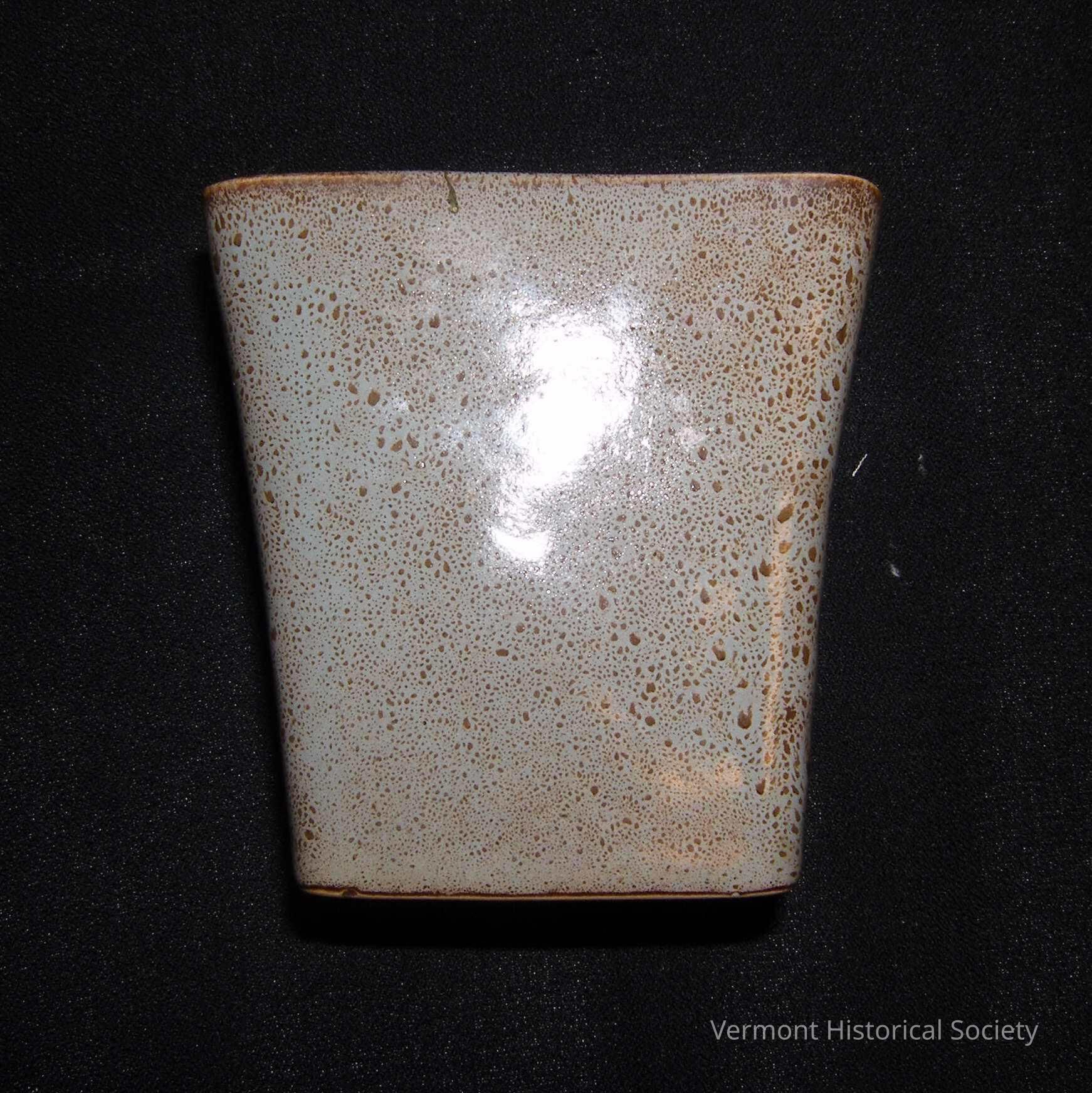 Rectangular porcelain vase that flares outwards toward the top rim. The glaze is light blue splattered with brown. The bottom (unglazed) is marked in ink, "Eckley".