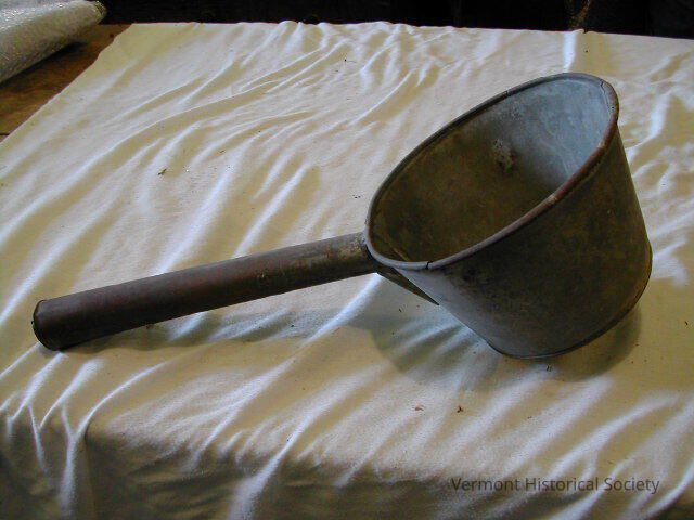 Tin dipper with long handle. The dipper is formed from sheets of flat tin, and the handle is rolled into a hollow tube.