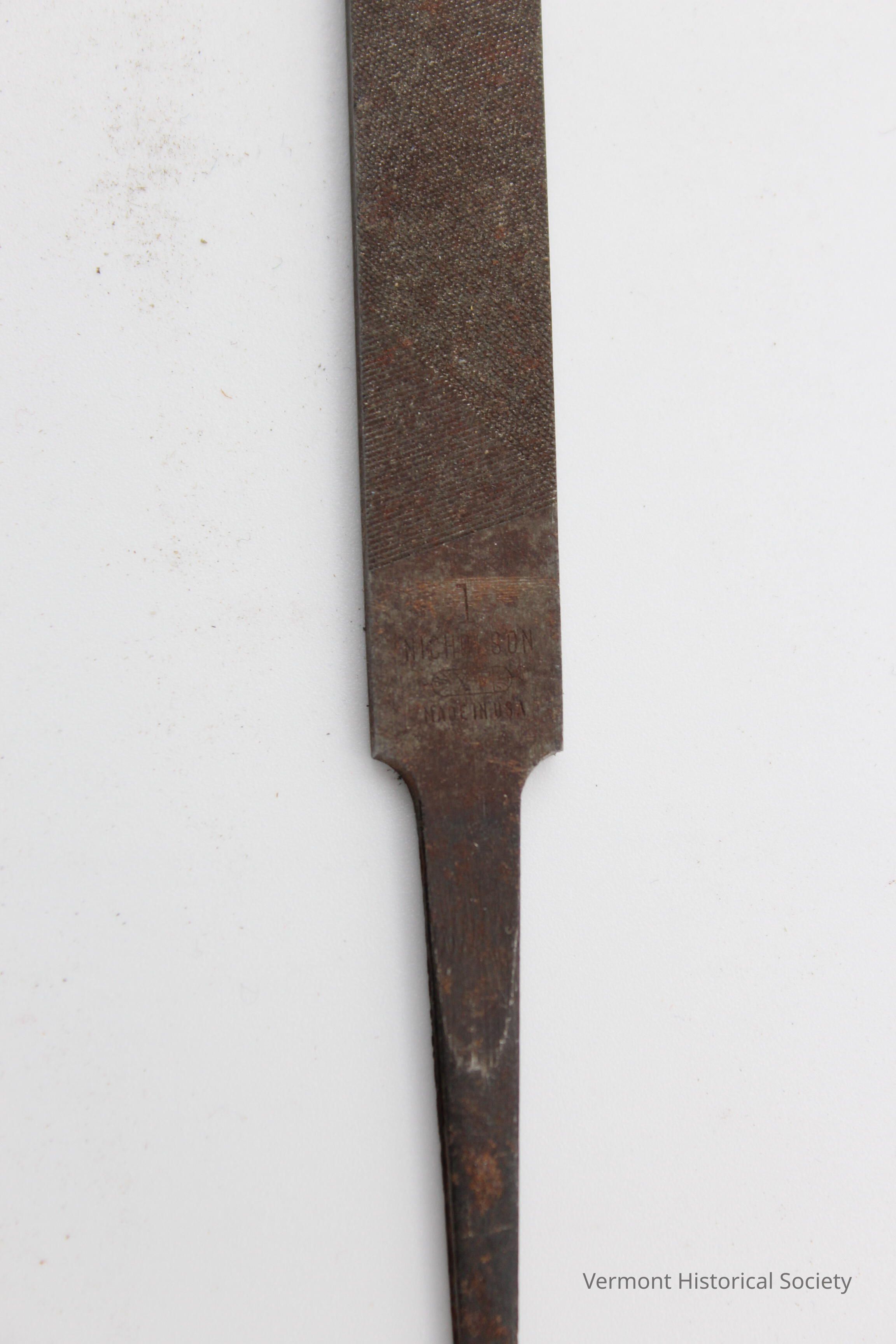 Metal hand file, no handle, squared point; overall length = 8 ½"; manufacturer's mark on heel shows a "1" and Nicholson.Context