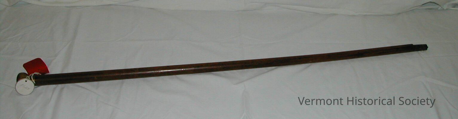 The knob of the case is a locomotive bell-tongue, case in the St. Albans, Vermont, railroad machine shop around 1861 by Hiram Maxim for Theron Webster. The bullet was embedded into the cane during the St. Albans Raid during the Civil War.