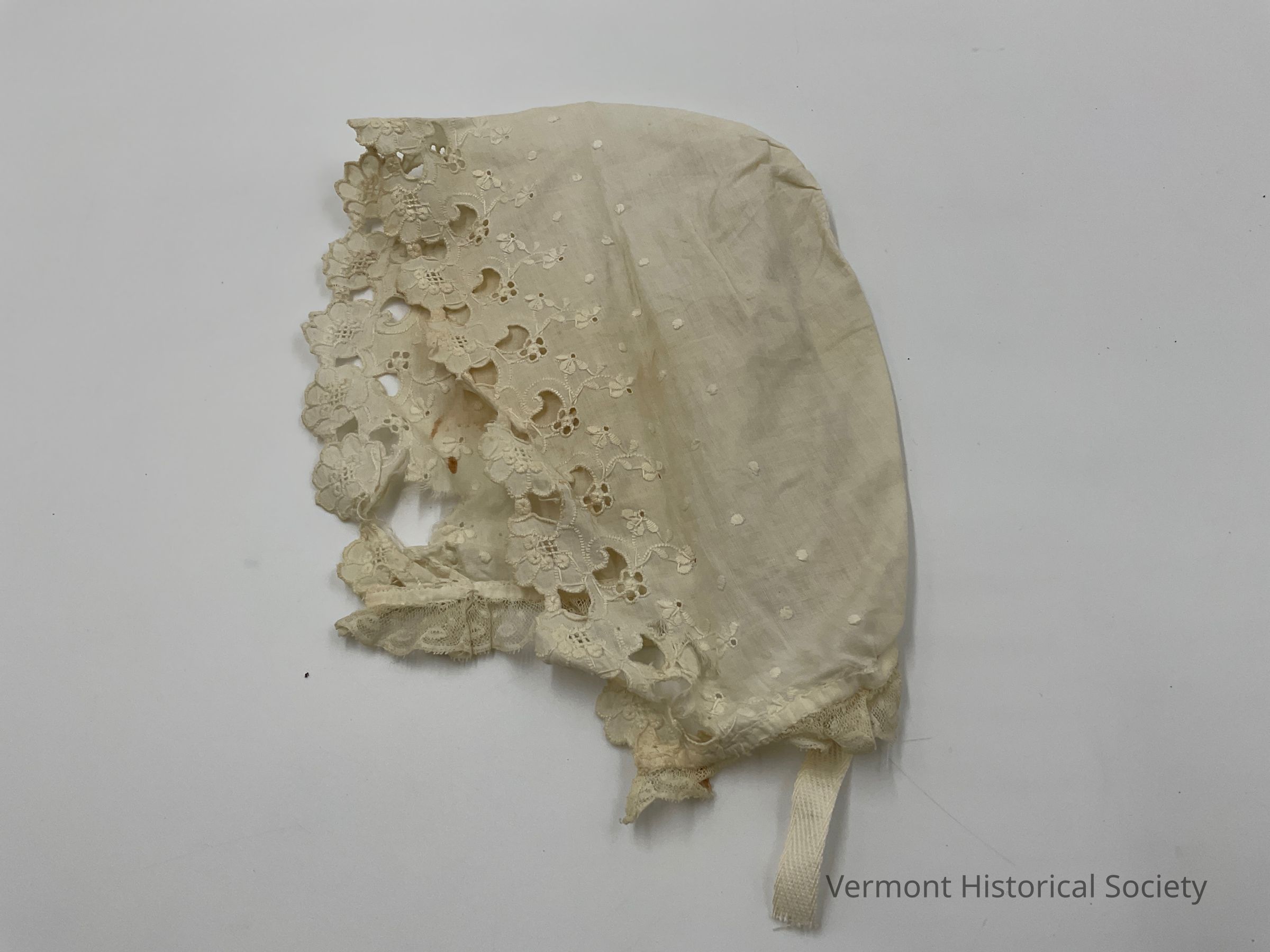 White cotton cap. It is brimless and fits close to the wearer's head. The front opening is decorated with whitework embroidery, eyelets, and a cutwork edge in the shape of flowers.