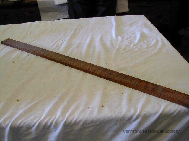 Wooden rule with gradations scored into the edge and numerals applied with indelible black ink. One side bears the mark, "SCRIBNER", and the other says "Made by /C.S. Manchester/March 1889."