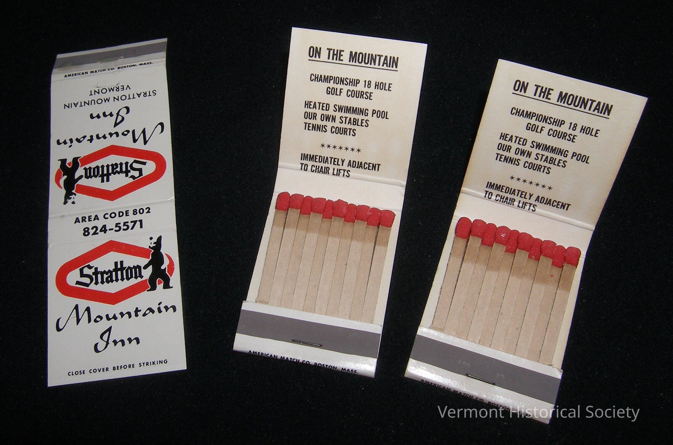 3 matching cardboard matchboxes. Each is printed on both sides with a logo consisting of an illustration of a bear next to a red diamond with the word "Stratton" above the words "Mountain Inn". This inside is printed with a list of amenities.Context