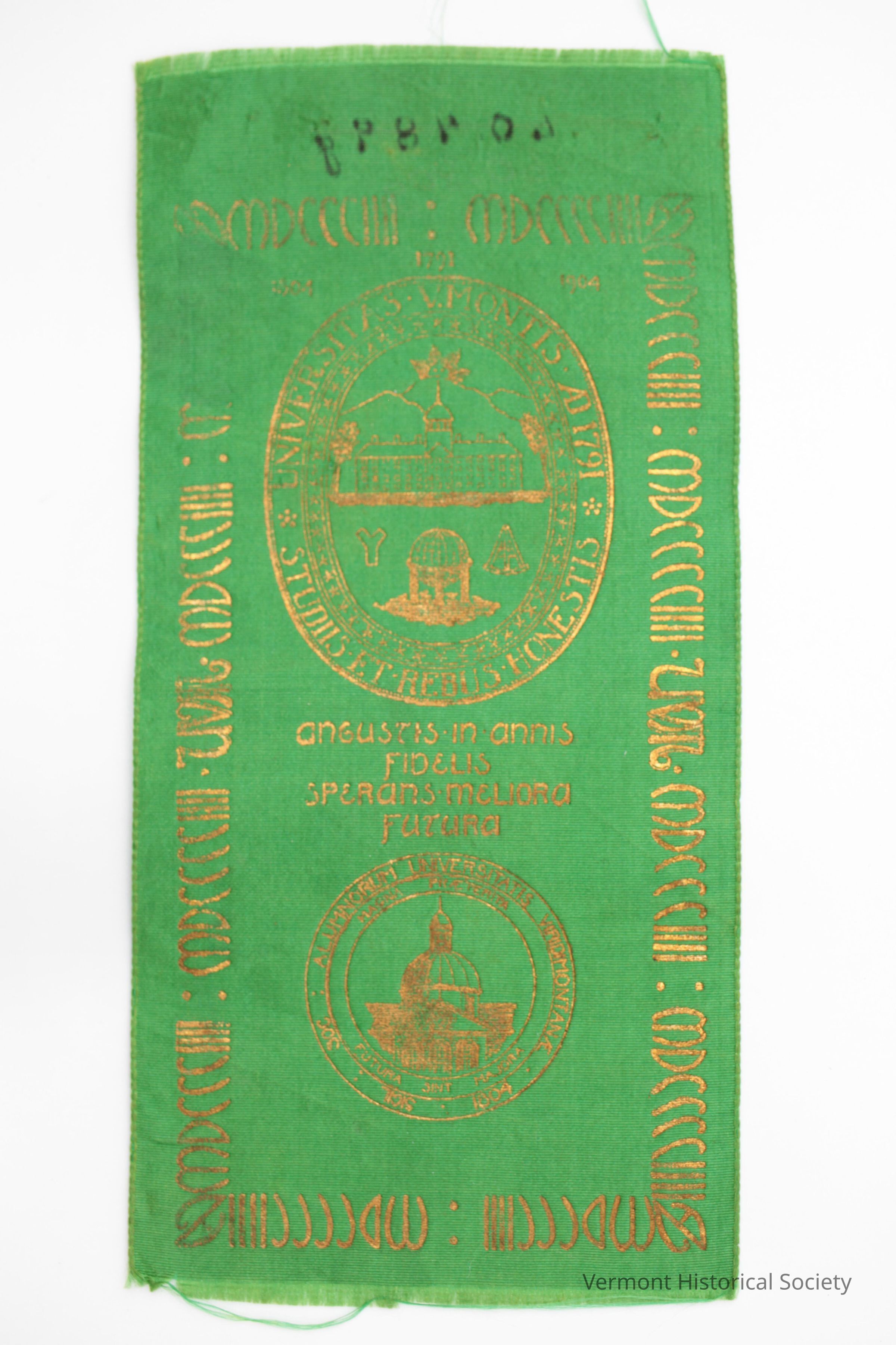 Green satin-woven silk ribbon. The ribbon is printed in gold with a border of Roman numeral years. The upper portion of the center is printed with a scene of a small domed temple or folly in front of a large Williams Hall (University of Vermont). The scene is circled by a Latin inscription that translates to "University of Vermont / Zeal and Honesty". The center inscription translates to "Ever faithful through the years, with hopes for a better future. The bottom is printed with an image of domed building ringed by an inscription that translates to "University students will be greater".
