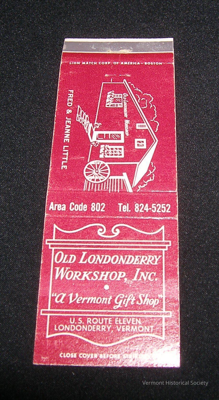 Cardboard matchbook. The front of the matchbook is red with white lettering that reads, "Old Londonderry Workshop, Inc. 'A Vermont Gift Shop', U.S. Route Eleven, Londonderry, Vermont". On the back of the matchbook, there is a line drawing of the workshop with the names "Fred & Jeanne Little" below it. Along the fold at the top of the matchbook, there is additional text that reads, "Area Code 802 Tel. 824-5252". Inside the matchbook, in red lettering, there is more information about the workshop, as well as a list of articles that are made or for sale there. Along the bottom edge of the matchbook, it reads, "Lion Match Corporation of America, Boston".Context