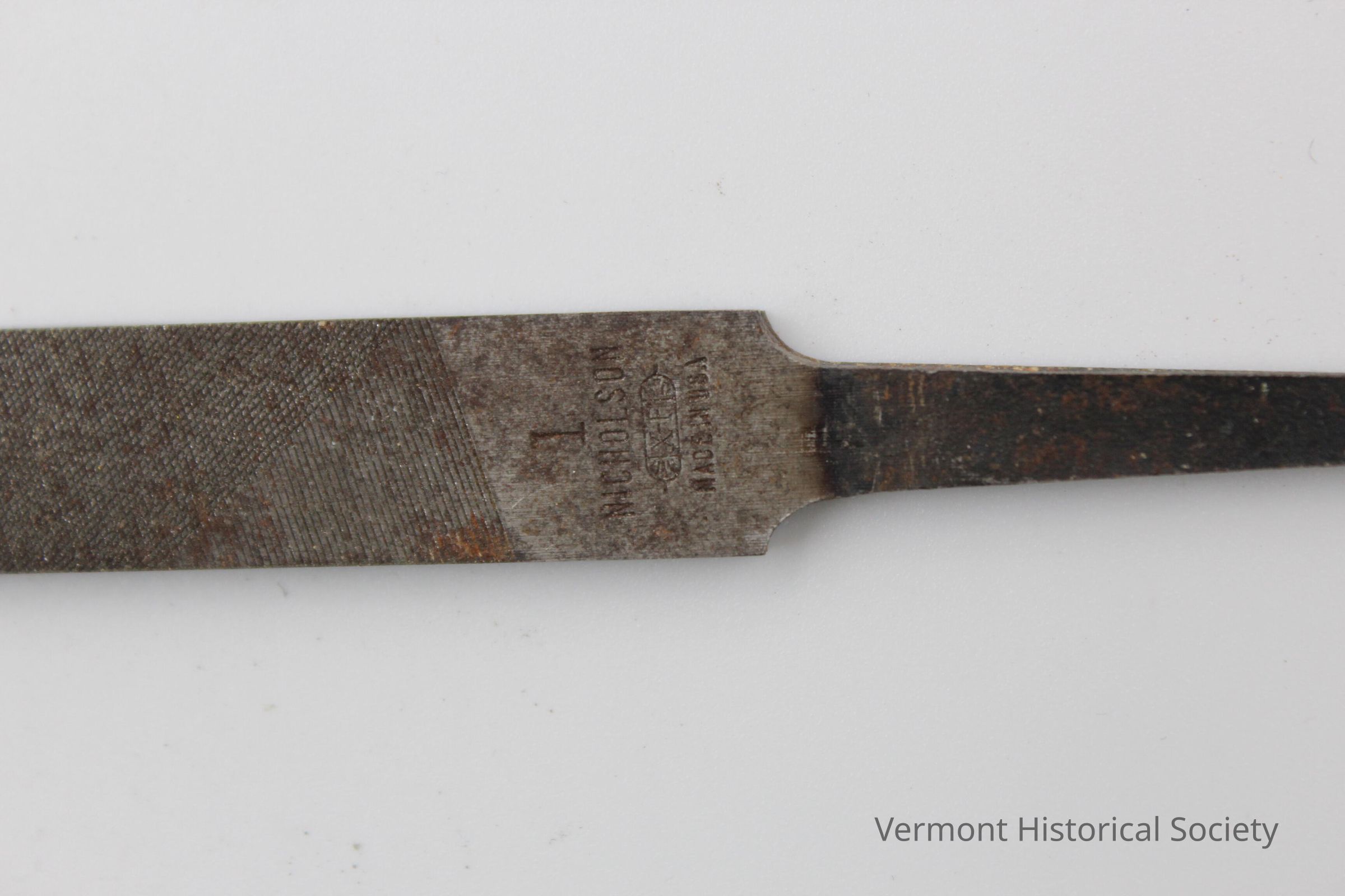 Metal hand file, no handle, squared point; overall length = 8 5/16"; manufacturer's mark on heel shows a "1" and Nicholson.Context
