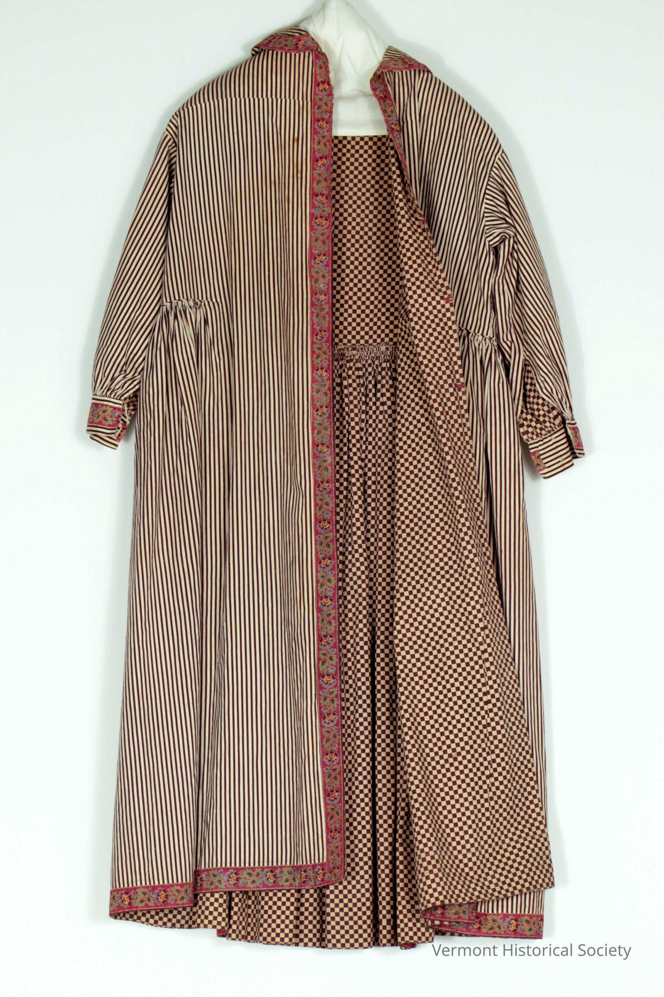 Brown-and-white striped dressing gown trimmed at the center opening, collar, cuffs, and hem with floral-printed red cotton tape. The waistline is gathered beginning at the front sides and stretching all the way around back. The gown is lined in a brown-and-white checked fabric of the same shades as the outside fabric.Context