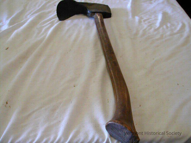 Hollowing adz consisting of a long wooden handle with a curved metal blade set perpendicular to it.