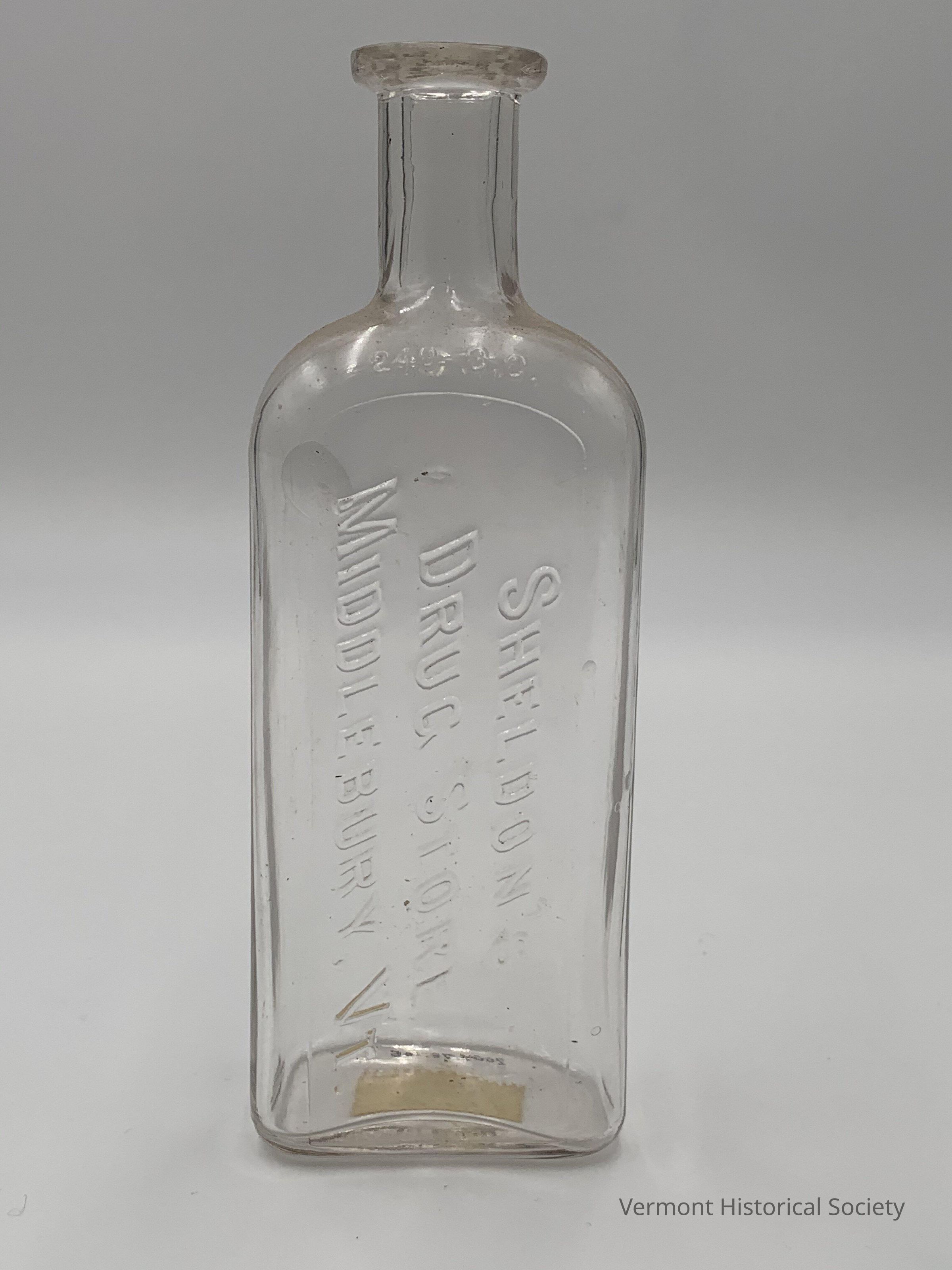 Clear glass bottle with the molded inscription, "SHELDON'S DRUG STORE MIDDLEBURY, VT."