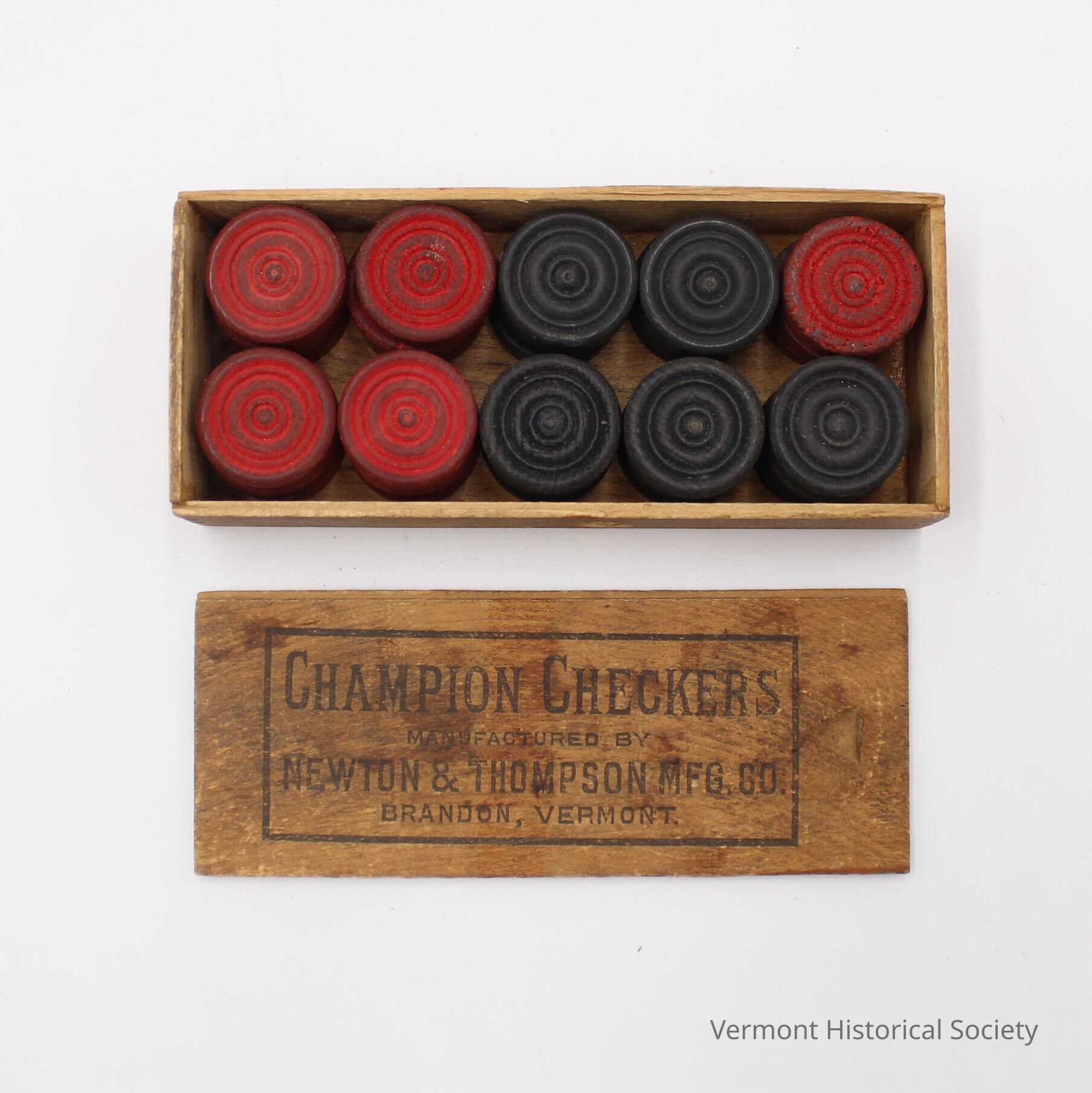 Rectangular wooden box containing 30 turned wooden disks (checkers pieces). 15 of the disks are painted red, and the other 15 are painted black. The lid of the box is printed with the inscription, "CHAMPION CHECKERS MANUFACTURED BY NEWTON & THOMPSON MFG. CO. BRANDON, VERMONT."