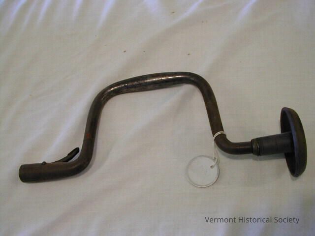 U-shaped metal brace with a round knob on one end and a hole on the other end for holding a bit.
