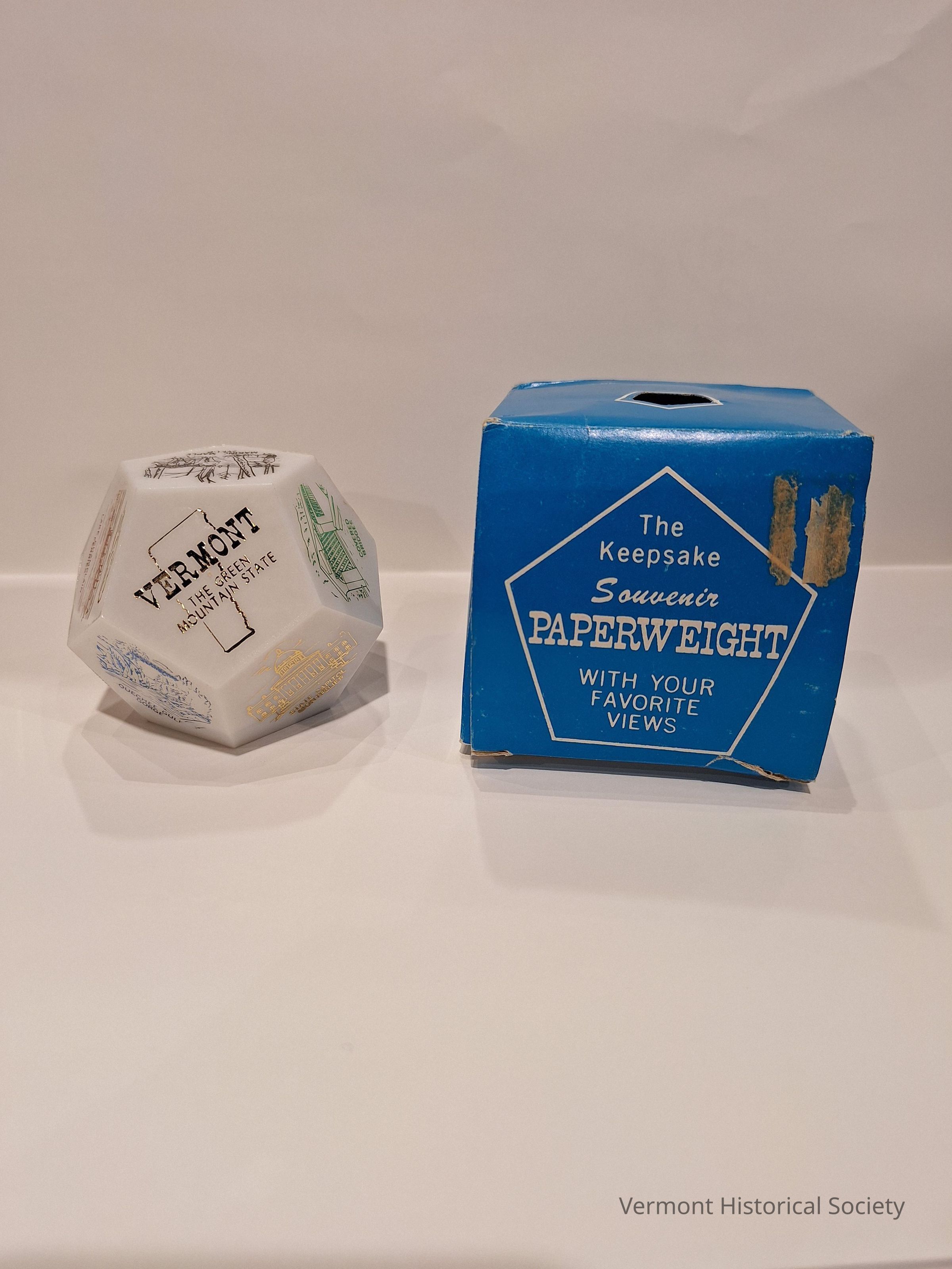 Pentagonal dodecahedron souvenir paperweight (a) with box (b). The white plastic paperweight's twelve sides each feature a different Vermont landmark with one side showing the outline of the state with the words "VERMONT THE GREEN MOUNTAIN STATE" in gold lettering. Landmarks are in metallic green, blue, black, red, and gold outlining. They feature the Lake Champlain ferries, making maple syrup, a covered bridge, the Hermit Thrush (Vermont's state bird) and red clover (Vermont's state flower), Bennington Battle Monument, Quechee Gulf Gorge, the State Capitol building, Granite Quarry at Barre, winter sports, Battery Park in Burlington, and a mountain chairlift. The blue cardboard box has white-edged pentagonal wording and cut-outs explaining the shape of the paperweight and identify it as "The Keepsake Souvenir Paperweight WITH YOUR FAVORITE VIEWS," and highlights that it will be, "A real conversation piece guaranteed to arouse curiosity and comment."Acquisition