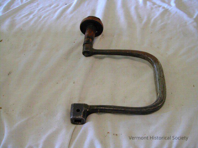 U-shaped metal brace with a round knob on one end and a hole on the other end for holding a bit.Context