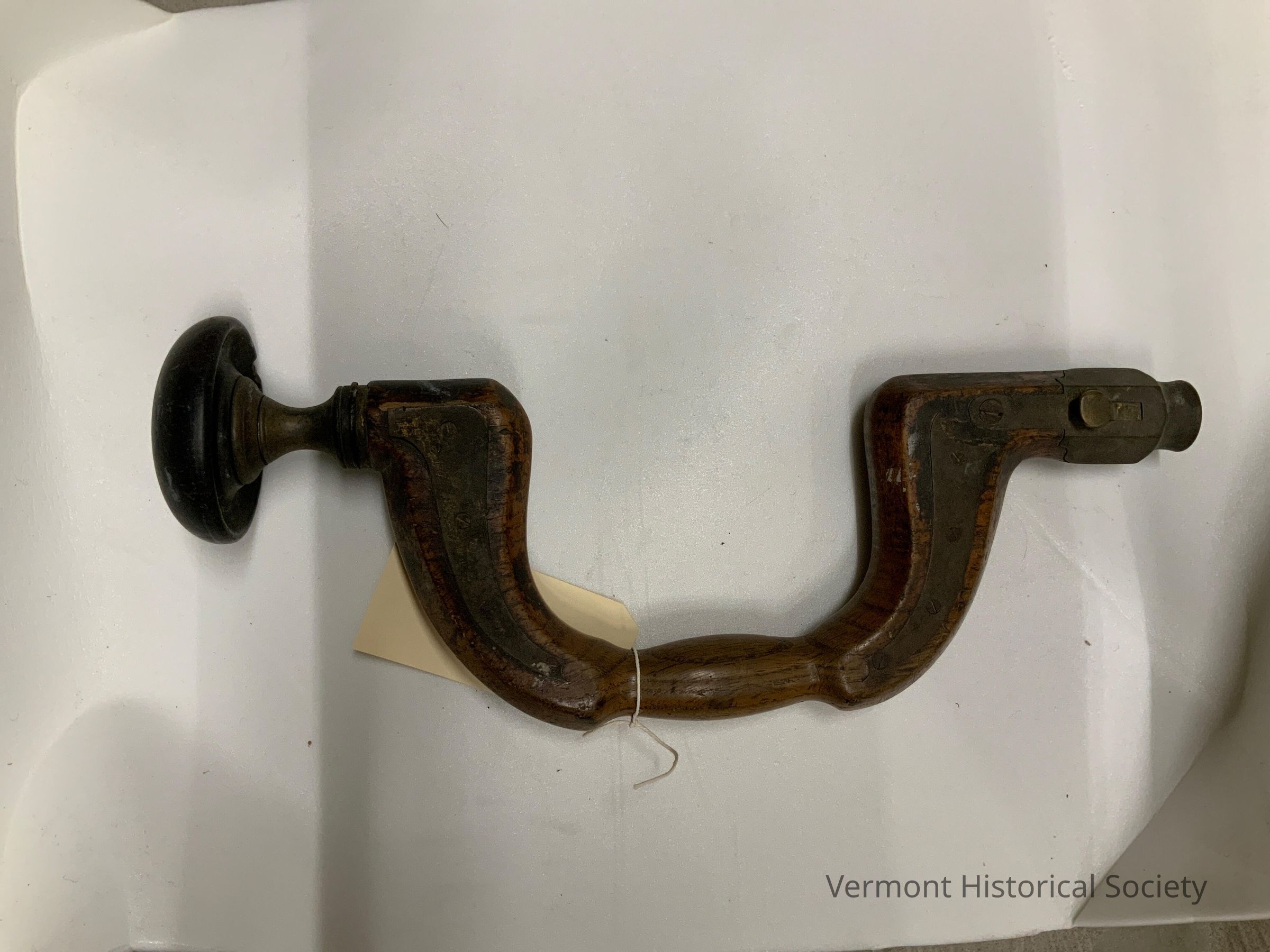 U-shaped wooden brace with a round knob on one end and a hole on the other end for holding a bit. The center of the "U" is carved into a rounded handle. There is a metal disk inlaid into the center of the knob and marked with a coat of arms and the number 986.Use