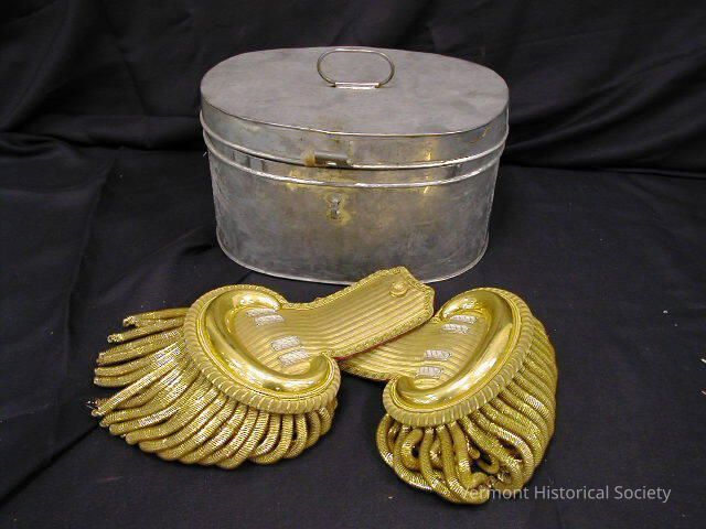 Pair of gold epaulets with gold fringe. The top of each epaulet is decorated with four silver bars. The epaulets are accompanied by their original tin carrying case.