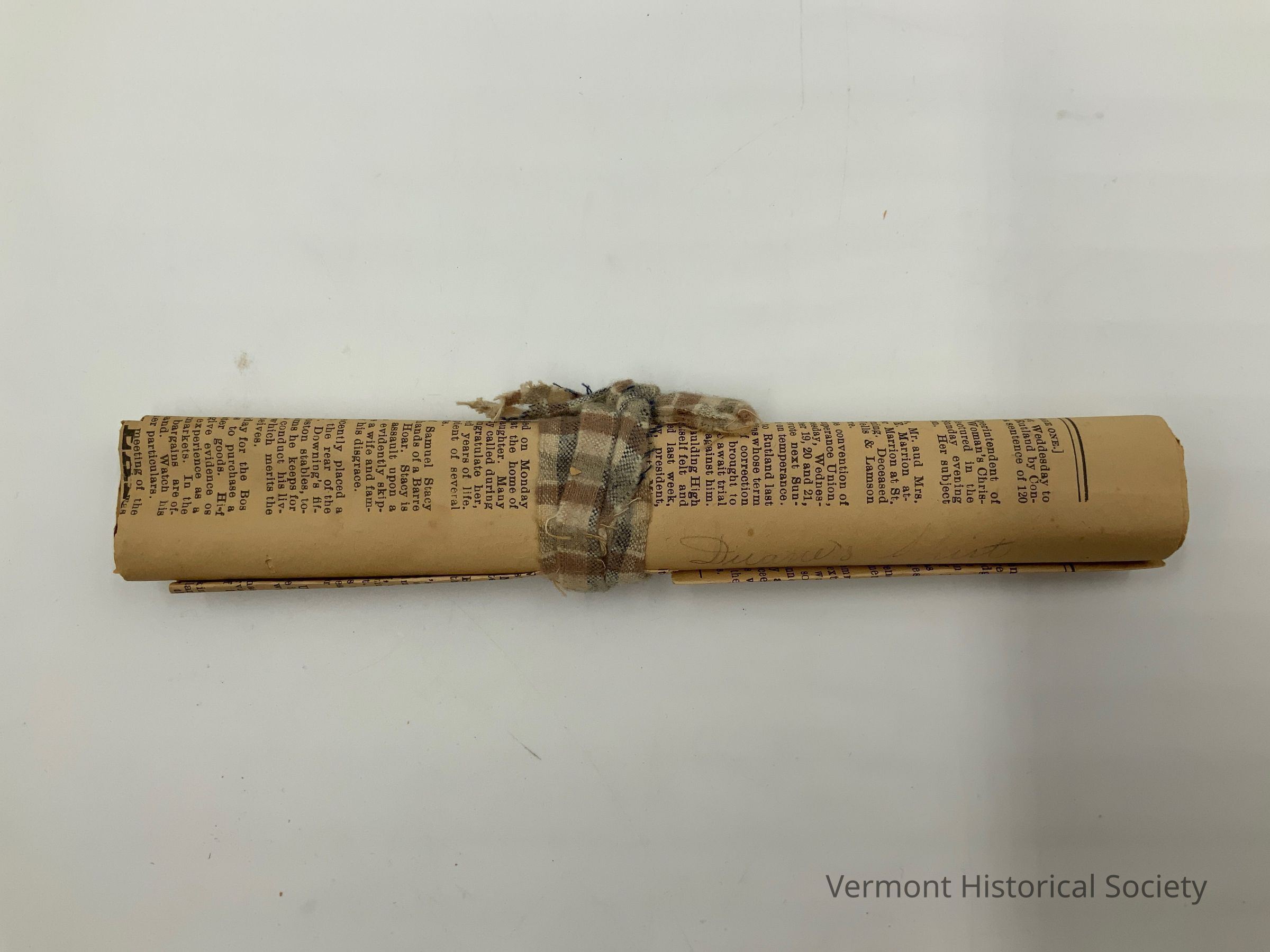 Sewing pattern cut from a newspaper. The pattern pieces are folded, then rolled together and tied with a strip of brown and blue plaid wool flannel. The outermost piece is labeled in pencil, "Duane's Shirt", along one edge.Context