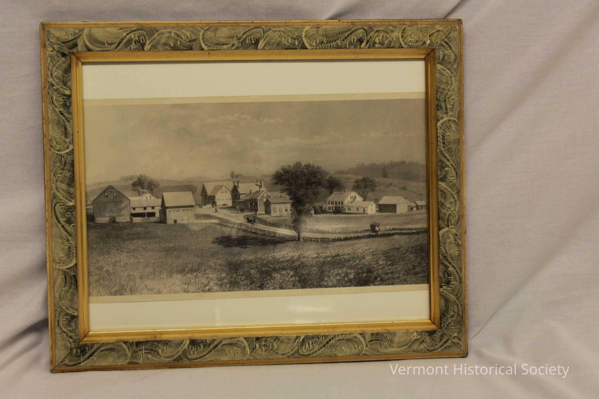 Framed photographic print of of a landscape painting. The painting shows a small village consisting of 6 residential buildings and 5 barns. There is a road running from the right edge through the center of the composition, on which are carriages and carts being pulled by horses. The frame is painted in imitation of marble.
