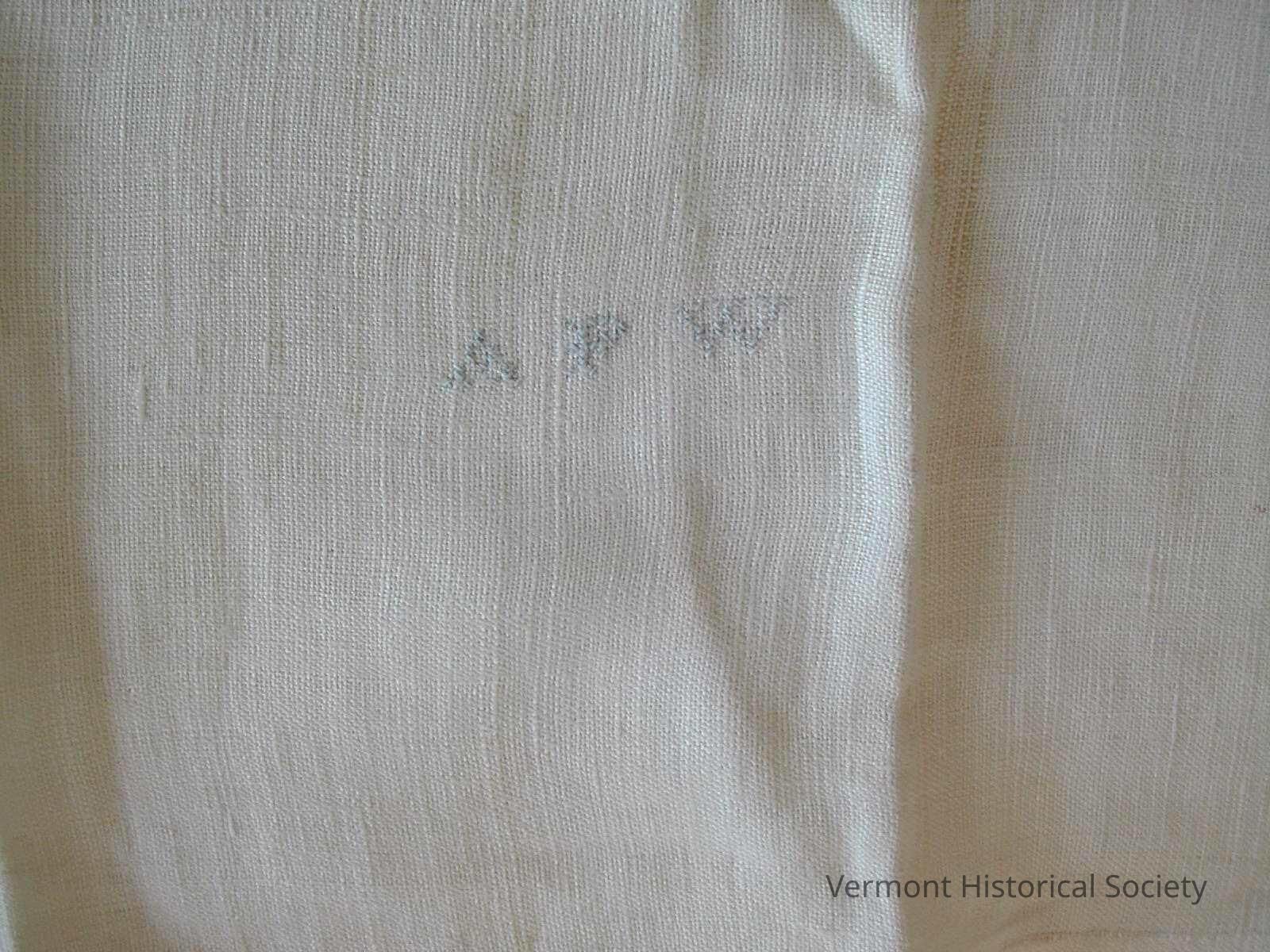 Plain-weave linen pillowcase. It is stitched in light blue with the initials "A P W".