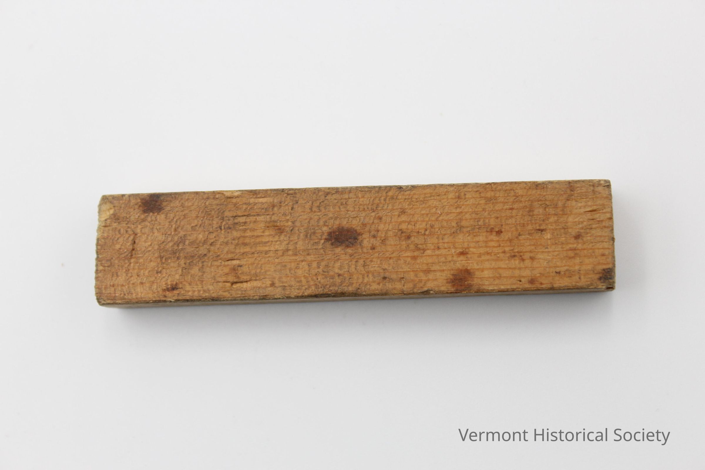 Small rectangular block of light-colored wood with hole in one end, possibly for inserting a file point.; homemade; 3 ½" x ¾".Context