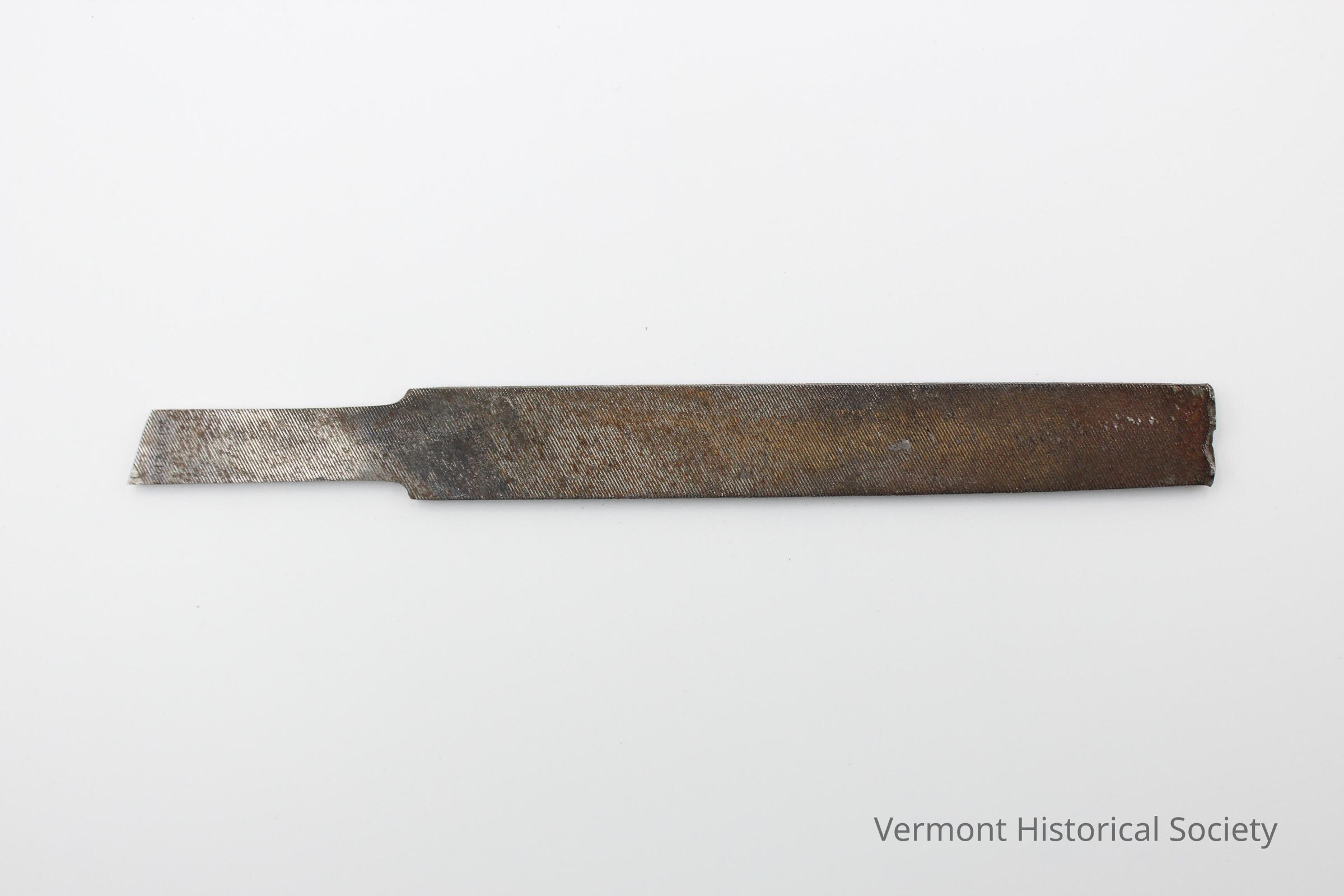 Metal hand file, no handle, broken untampered tang, or possible part of the file itself as it has ridges; square end damaged; length = 7 1/8"; no manufacturer's mark.Context