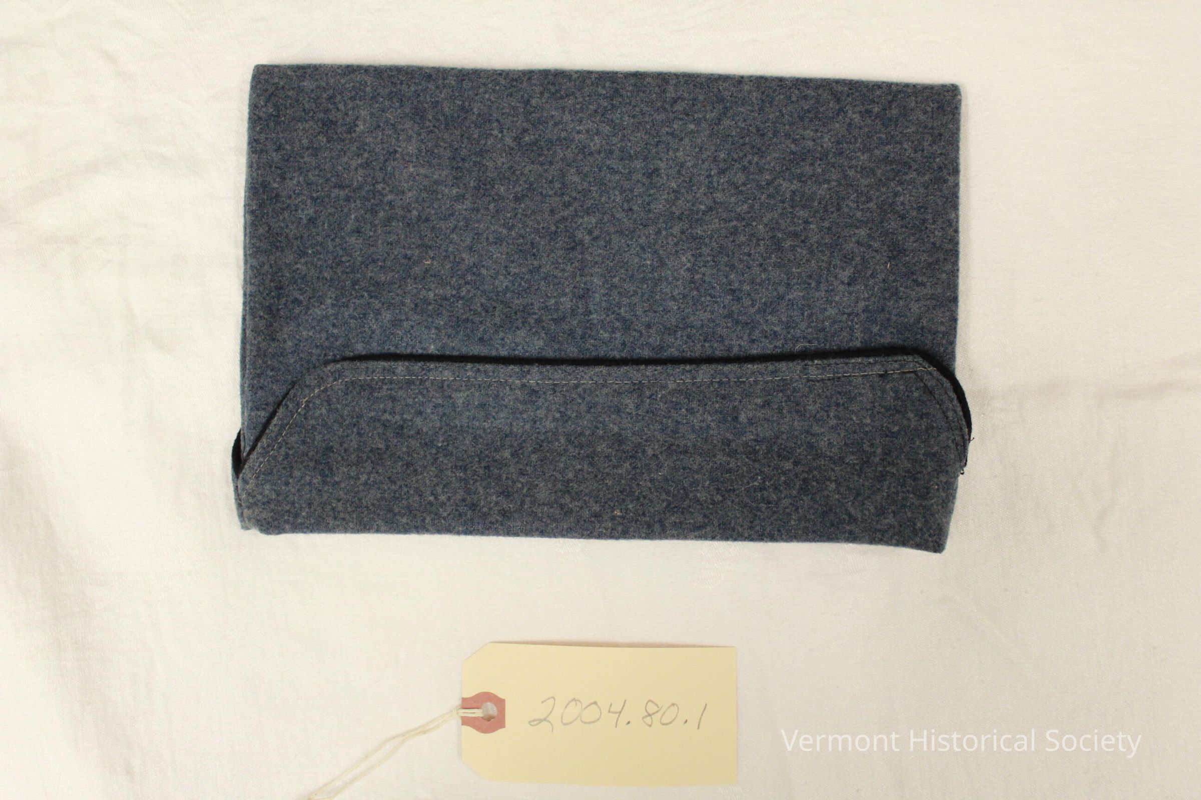 Tall, heathered blue wool garrison cap. There is dark piping around the folded up edge. There is a leather band around the interior that is marked with the size "6 7/8" and the label, "S Abrahams Philada. PA. Manufacturers of HIGH GRADE UNIFORMS."