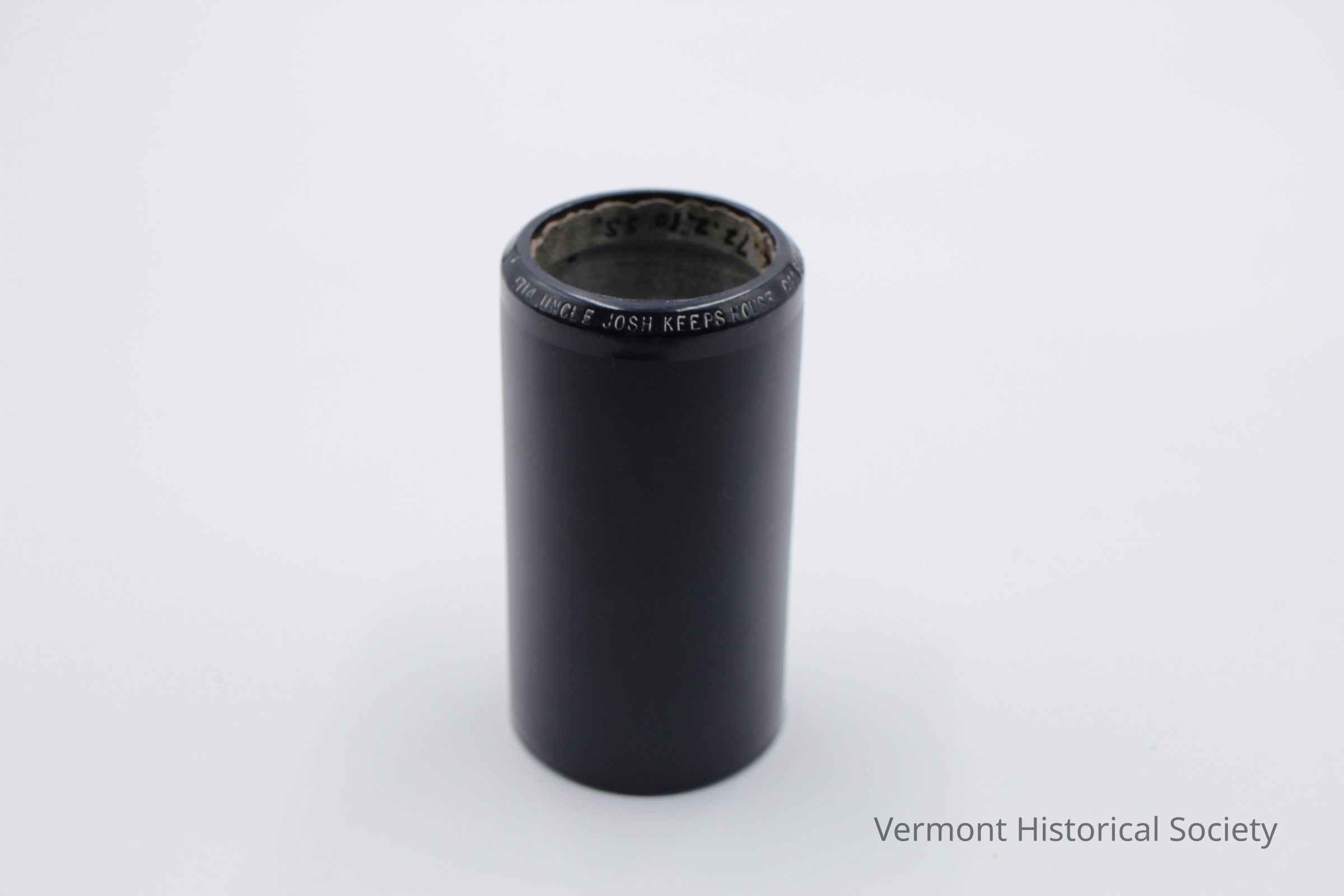 Blue phonograph cylinder with a cardboard case. The cylinder, or "record", is a hollow cylinder consisting of hard, blue, ridged celluloid around a concrete core. One edge of the cylinder is labeled in white with the words, "1714 UNCLE JOSH KEEPS HOUSE CAL STEWART / Thomas A Edison PAT'D. 24 3321".Use