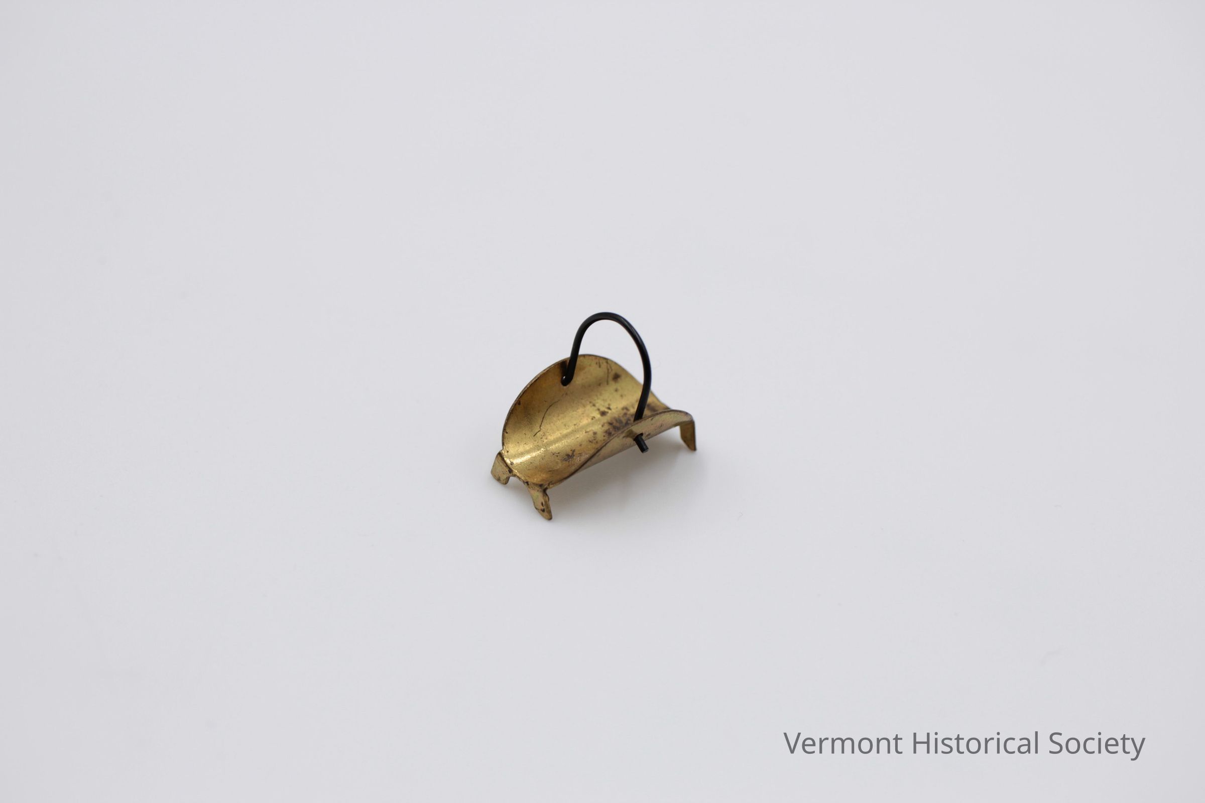 Miniature metal log holder consisting of a U-shaped tray on four feet with a U-shaped wire handle across the center top.Context