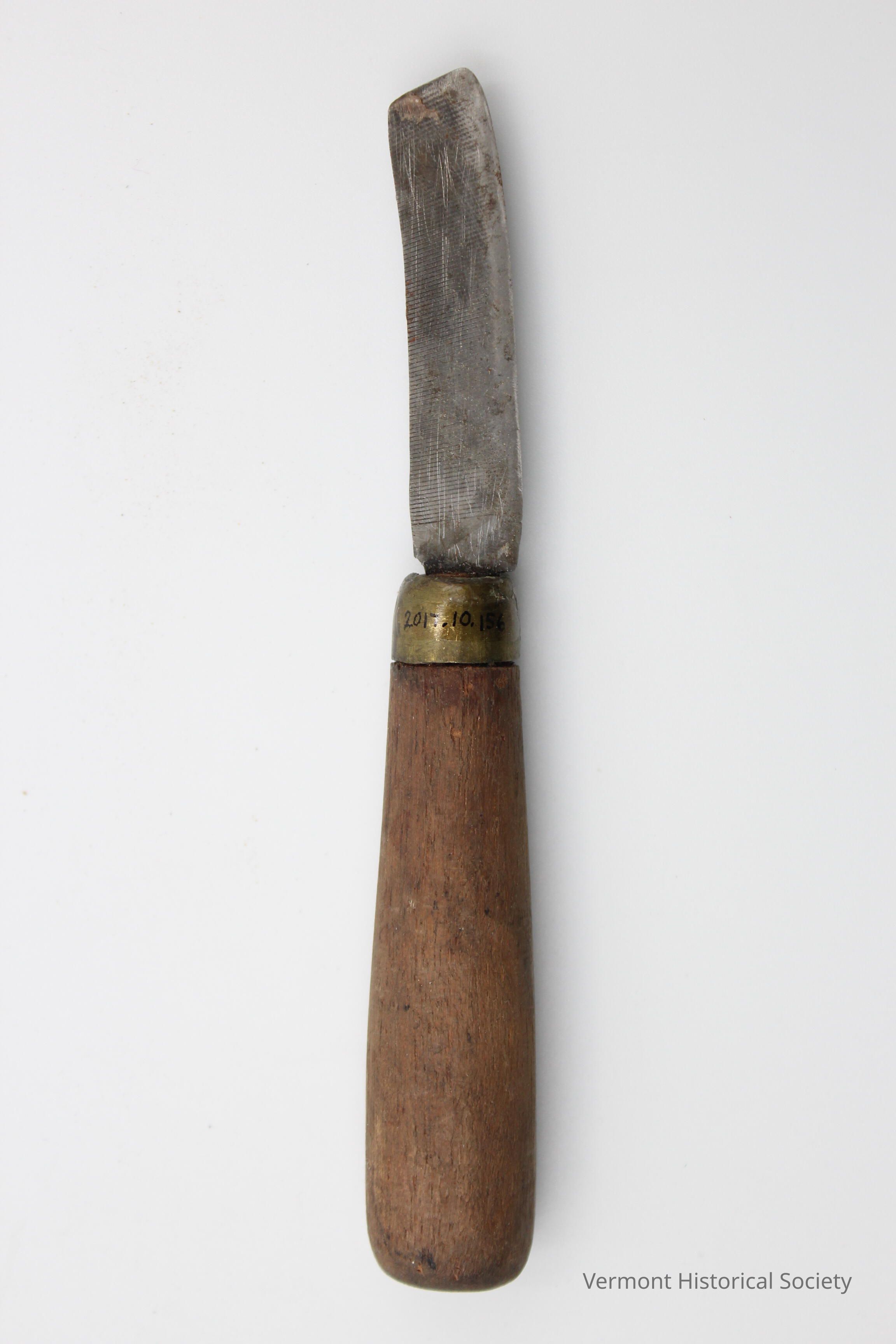 Knife, wood handle, metal blade with a squared-off angled tip; brass cap between the blade and the handle; no manufacturer's mark; length = 5".