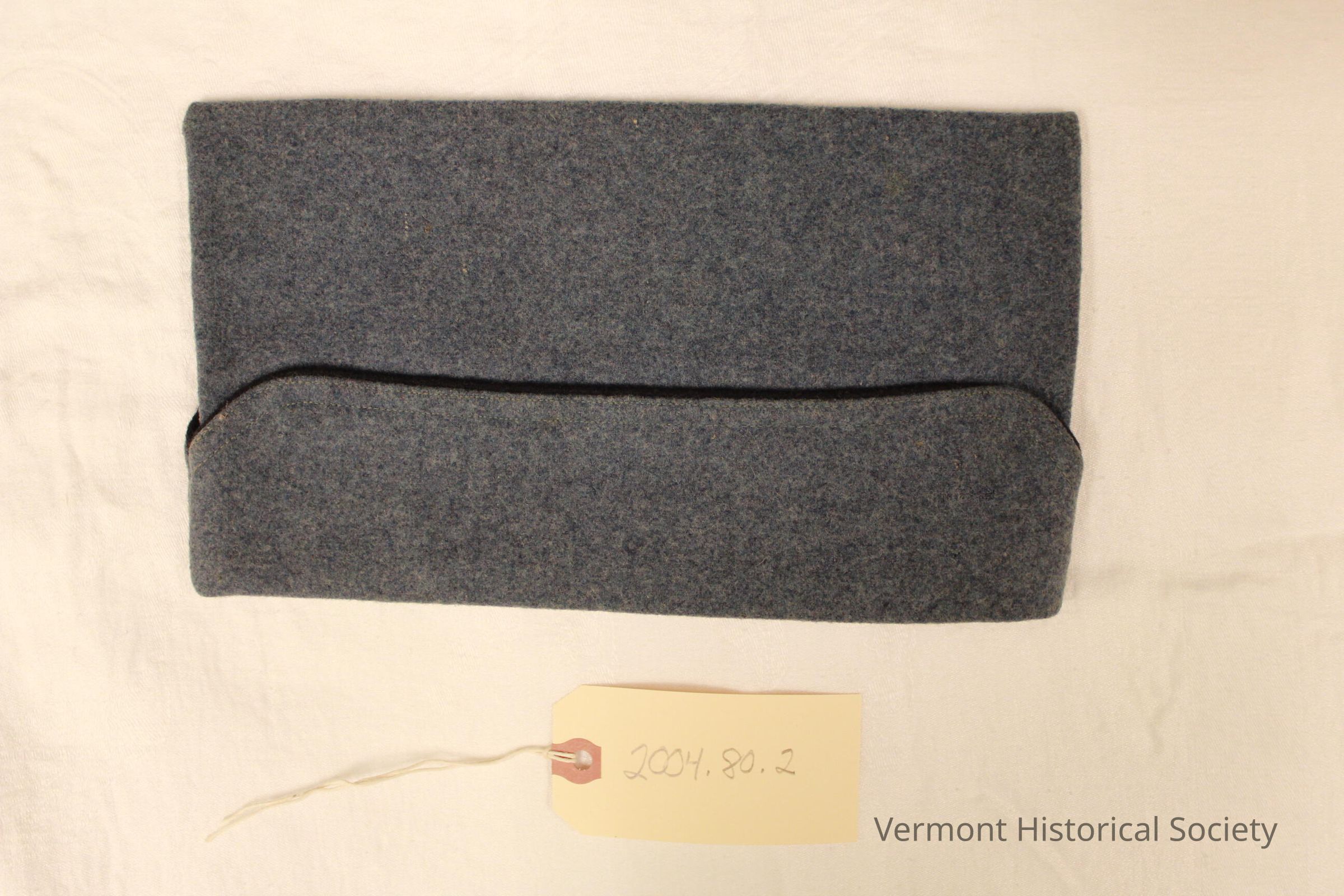 Tall, heathered blue wool garrison cap. There is dark piping around the folded up edge. There is a leather band around the interior that is marked with the size "6 7/8" and the label, "S Abrahams Philada. PA. Manufacturers of HIGH GRADE UNIFORMS."
