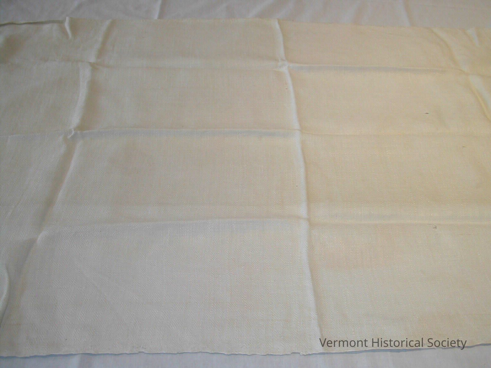 White linen towel. It is woven in a birdseye twill pattern. There are tabs for hanging on two ends. The sides are selvedges and the ends are hemmed. The initials "M.H.W" are cross stitched into the towel in grey thread.