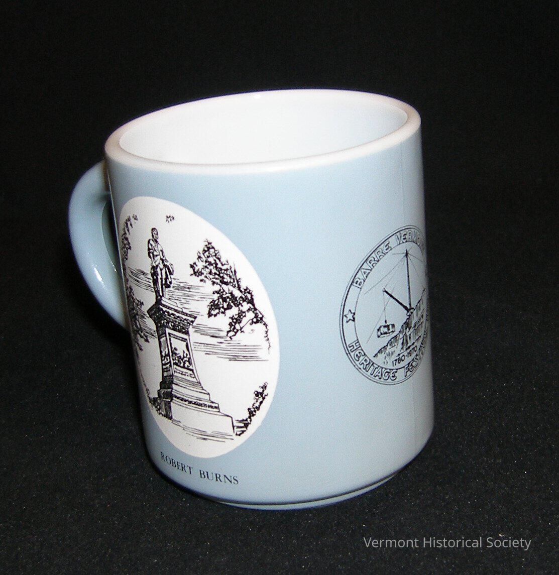 Opaque, white glass coffee mug with a printed blue wrap on the exterior. Within two white ovals on either side of the mug are line drawings of monuments. One is labeled, "ROBERT BURNS", and the other is labeled, "YOUTH TRIUMPHANT". Between the two ovals is a circular logo showing a crane in a quarry with the words, "BARRE VERMONT / HERITAGE FESTIVAL".Context