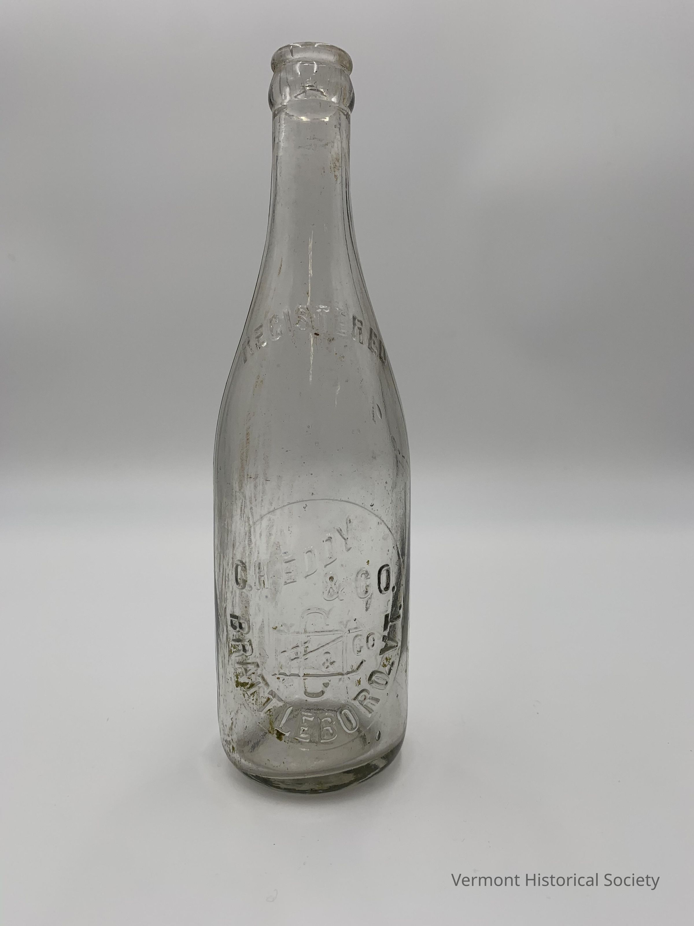 Clear glass soda bottle molded with the inscription, “C. H. EDDY & CO. BRATTLEBORO, VT." around a decorative monogram of the business' initials.