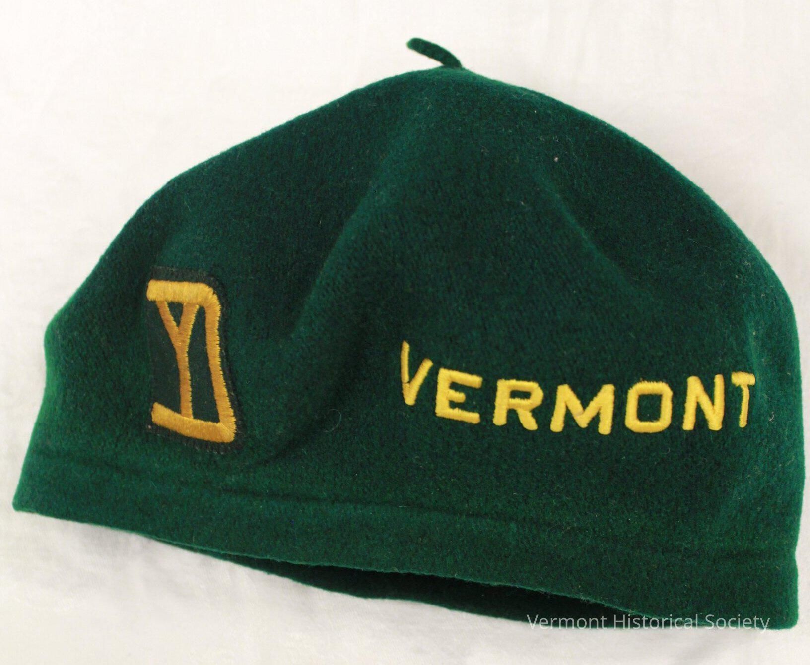 This is a dark green wool felt beret with a small stem on the top. It is embroidered in yellow with the connected initials "YD" (the logo of the Yankee Division), and the word, "VERMONT".