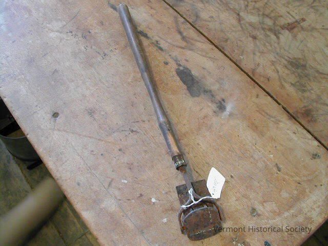 Box scraper plane. The plane consists of a flat piece of metal attached to a U-shaped holder, through which a metal chisel blade is inserted. The U-shaped holder has a central bar that attaches to a long, turned wooden handle.