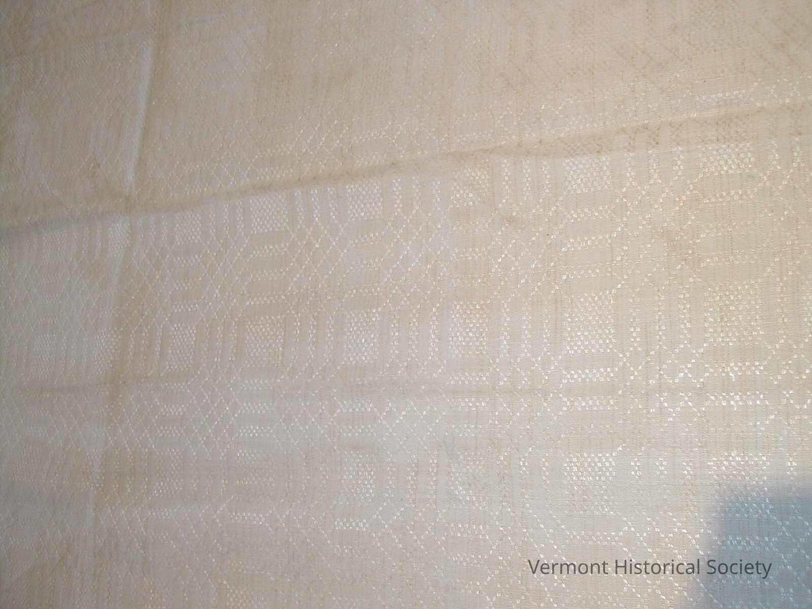 White linen towel. It is woven in a spot weave, reminiscent of woven coverlets. There are thread loops for hanging at the center of two sides. The initials "M.H.W" are cross stitched into the towel in tan-colored thread.