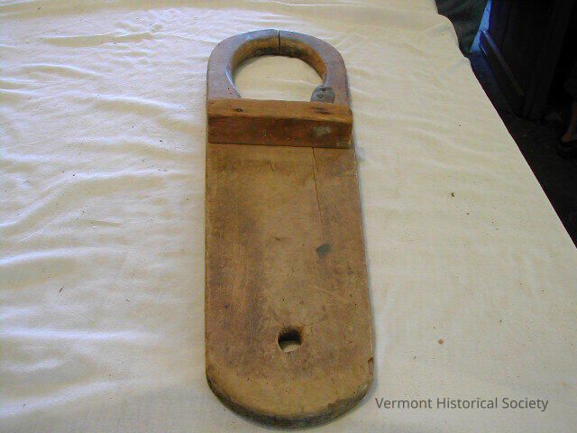Wooden boot jack consisting of a board with rounded ends. One end of the board has a small, round hole, presumably for hanging, while the other has a very large round hole. A smaller block of wood is secured near the large hole.Context