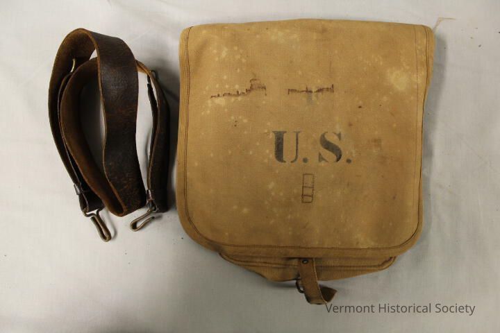Khaki haversack with "U.S." stenciled onto the front flap. The bag closes with a flap that reaches from the top back to the bottom front, and secures with a buckle. There are two metal rings at the top back, to which a long leather strap attaches with hooks.Context