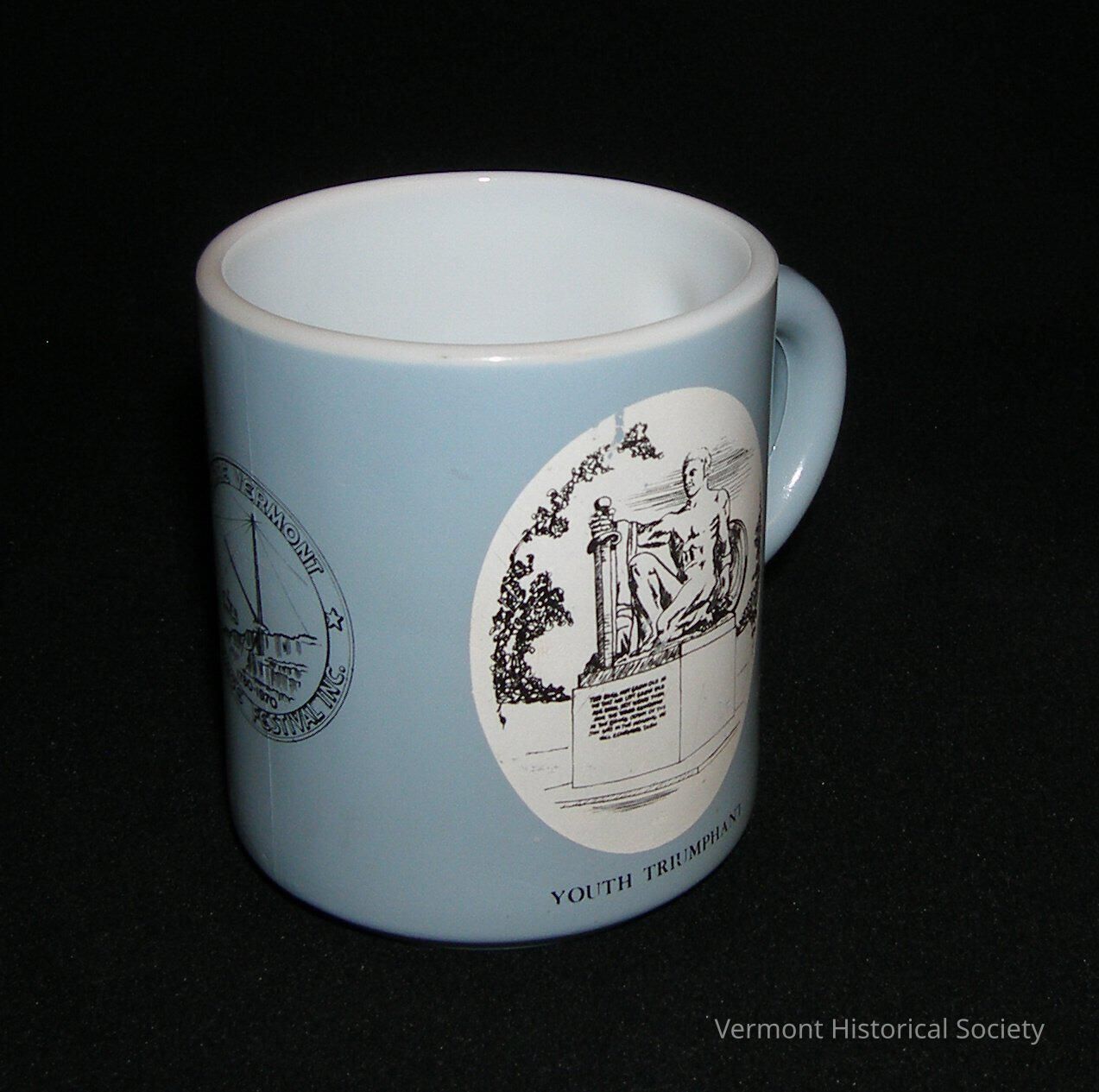 Opaque, white glass coffee mug with a printed blue wrap on the exterior. Within two white ovals on either side of the mug are line drawings of monuments. One is labeled, "ROBERT BURNS", and the other is labeled, "YOUTH TRIUMPHANT". Between the two ovals is a circular logo showing a crane in a quarry with the words, "BARRE VERMONT / HERITAGE FESTIVAL".Context