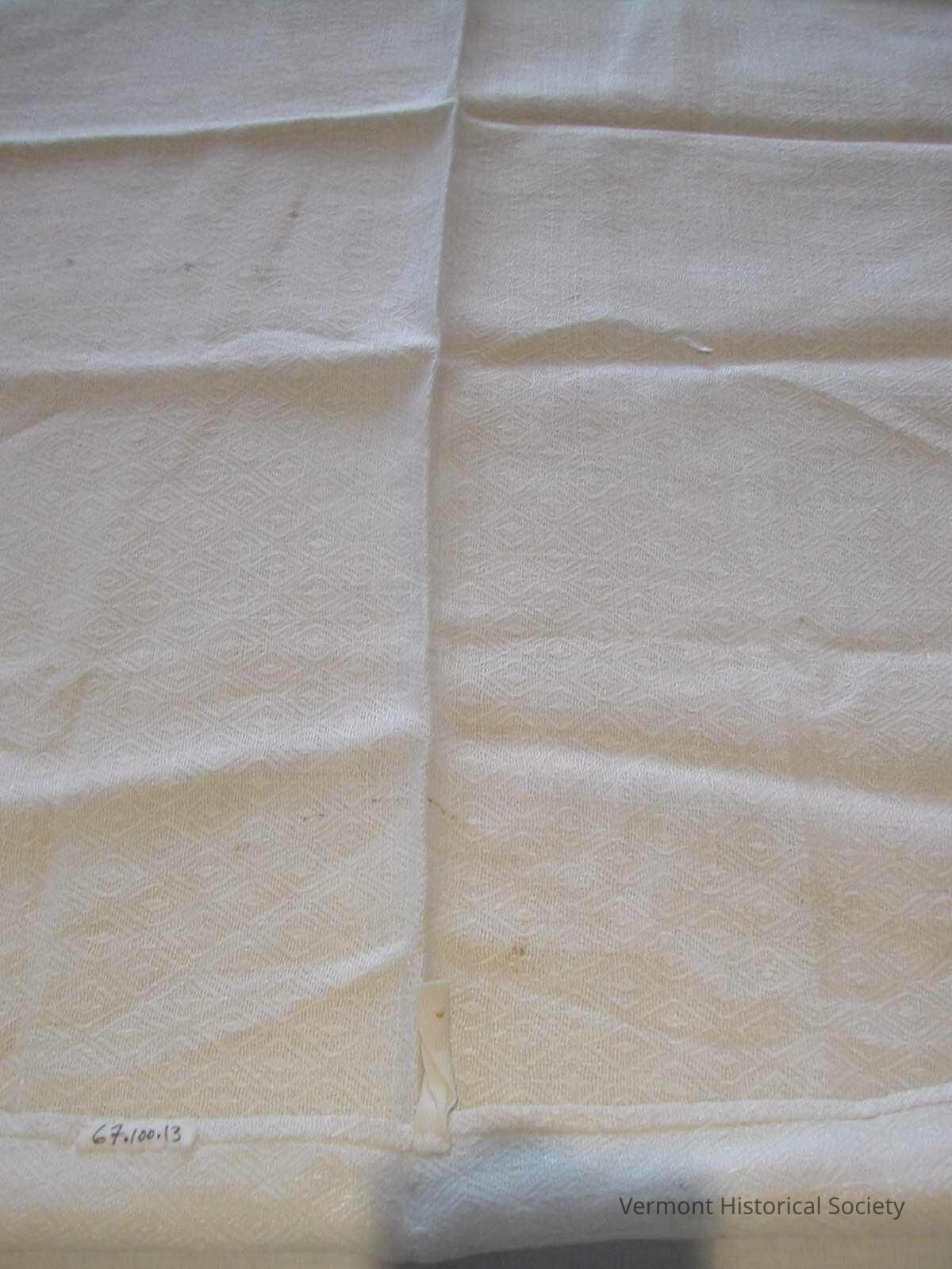 White linen towel. It is woven in a birdseye twill pattern. There is a tab for hanging at one end. It is marked with the number 5 in one corner.